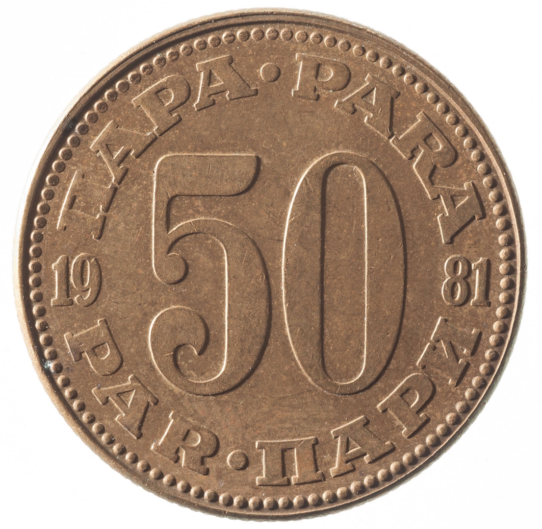 U sredini broj 50 (nominala), a oko njega tekst PARA na četiri jezika. U sredini uz lijevi i desni rub upisana godina 1981.