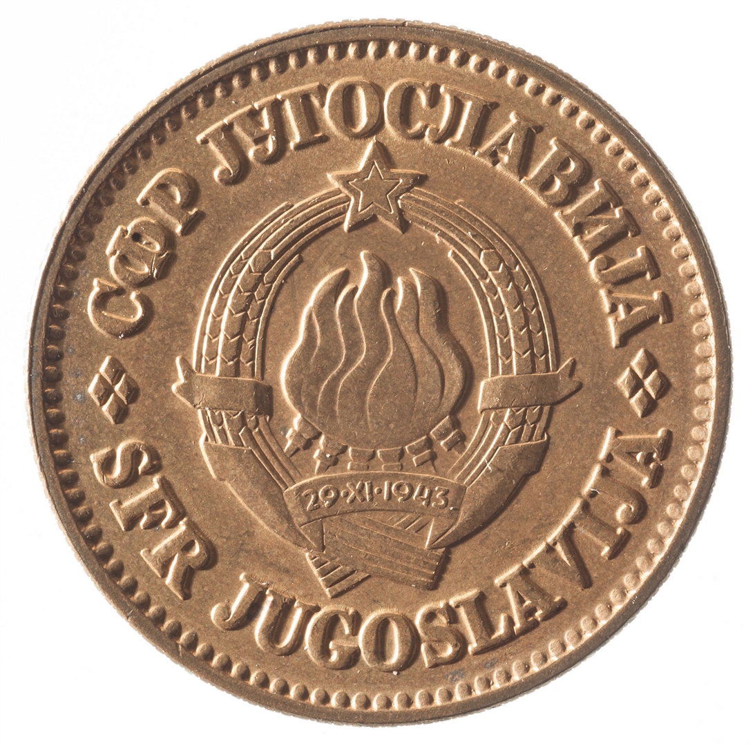 U sredini državni grb. U gornjem djelu uz rub polukružno napisan tekst SFR JUGOSLAVIJA na latinici i ćirilici.
