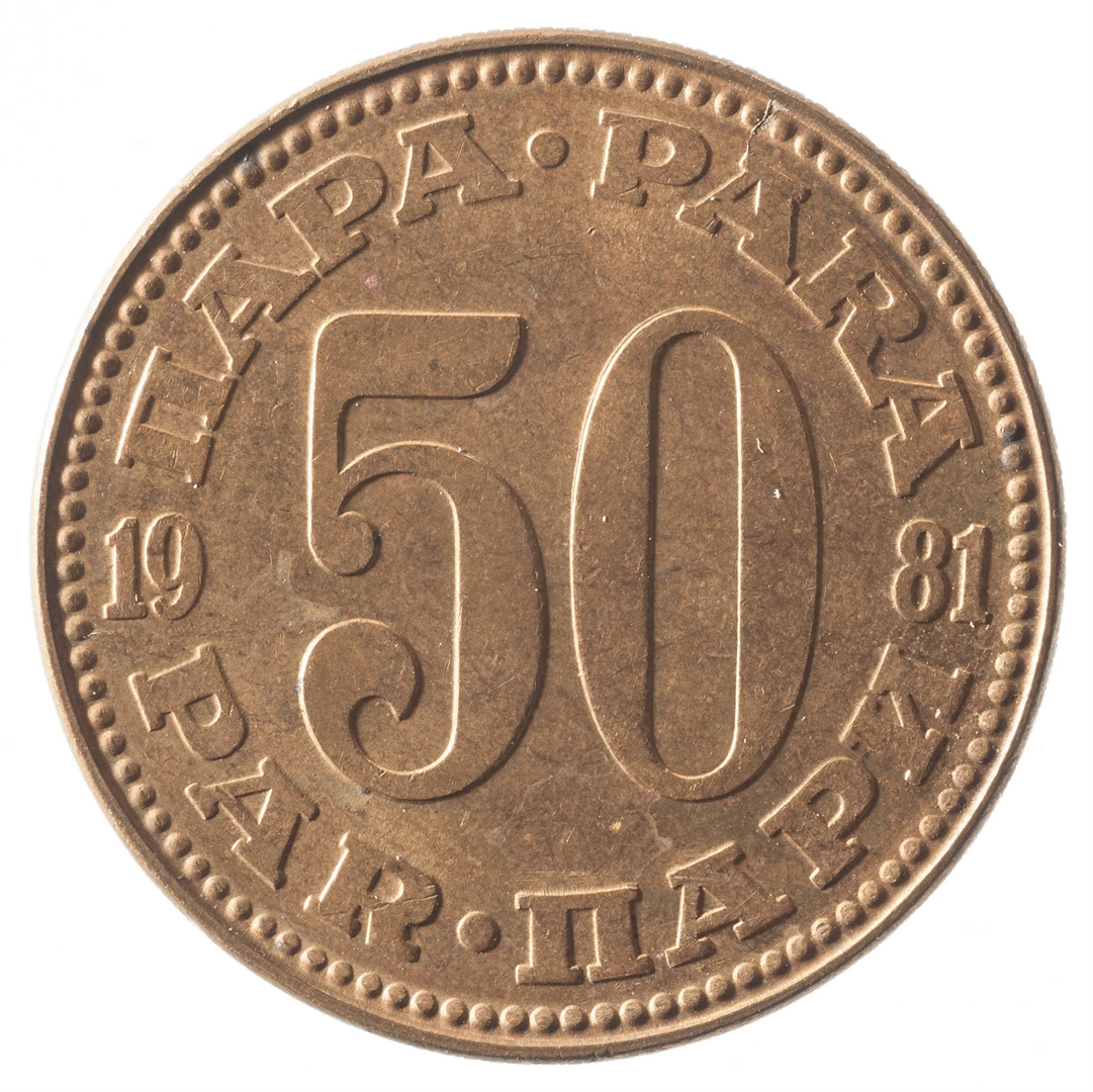 U sredini broj 50 (nominala), a oko njega tekst PARA na četiri jezika. U sredini uz lijevi i desni rub upisana godina 1981.