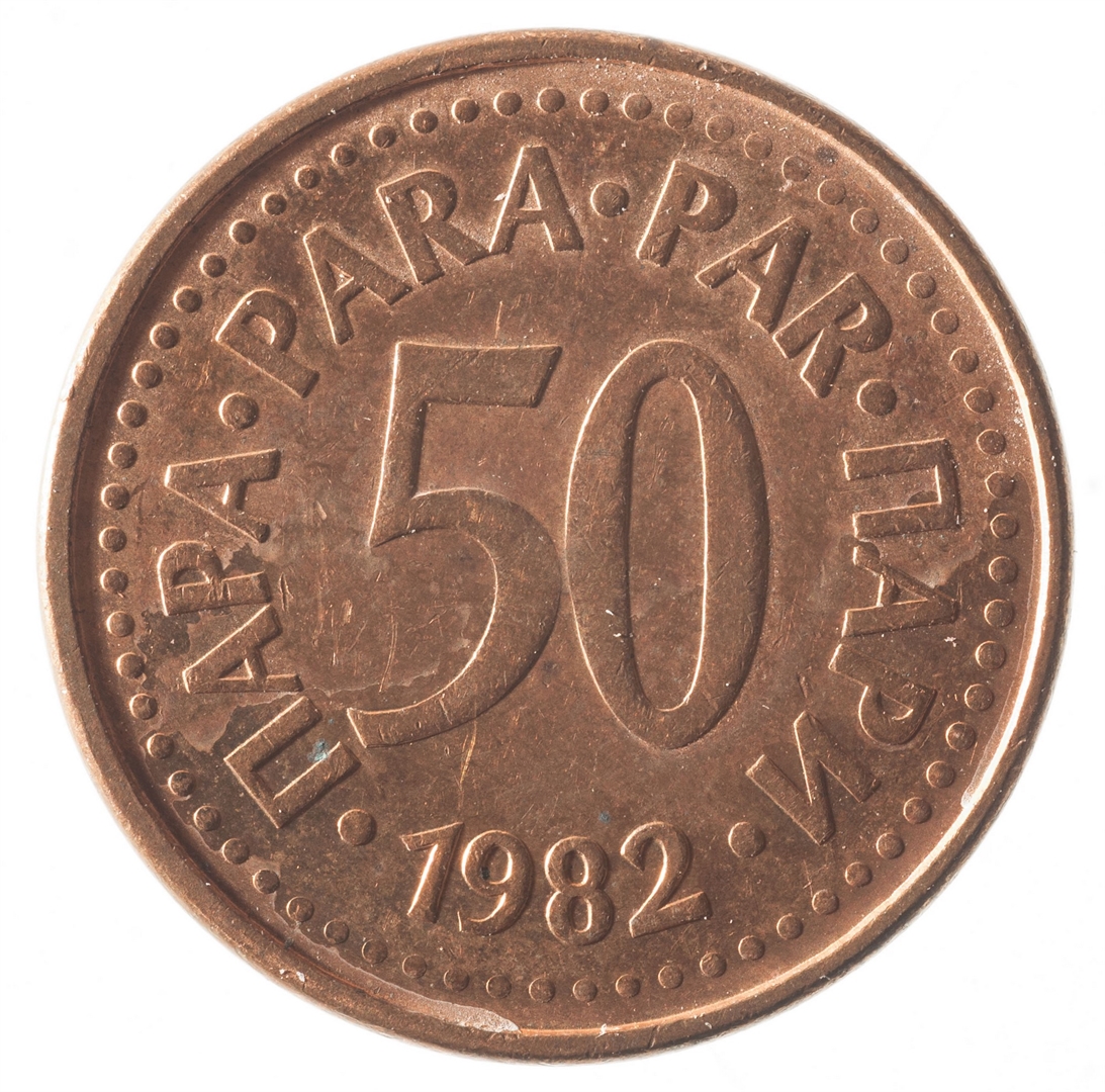 U sredini broj 50 (nominala), oko njega tekst PARA na četiri jezika, a ispod toga godina 1982.