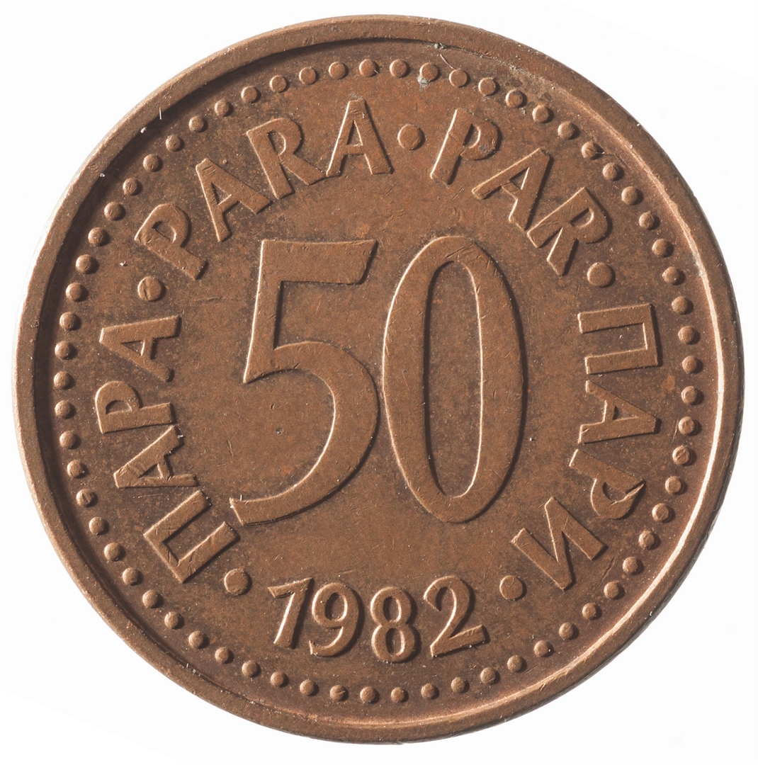 U sredini broj 50 (nominala), oko njega tekst PARA na četiri jezika, a ispod toga godina 1982.