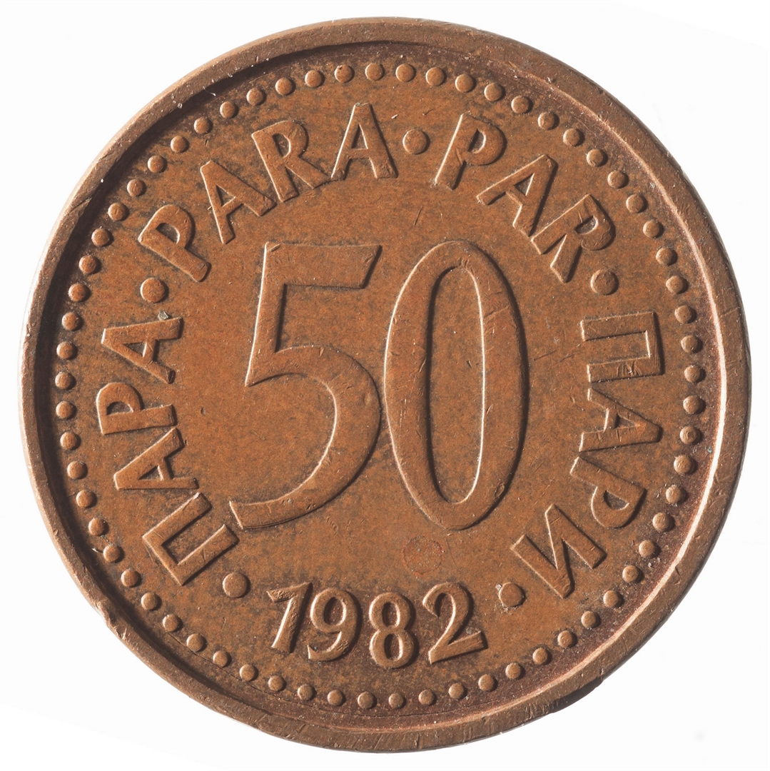U sredini broj 50 (nominala), oko njega tekst PARA na četiri jezika, a ispod toga godina 1982.
