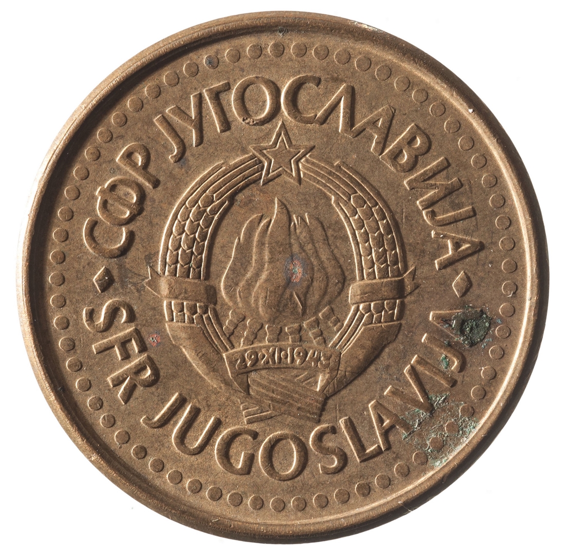 U sredini državni grb. U oko njega uz rub polukružno napisan tekst SFR JUGOSLAVIJA na latinici i ćirilici.