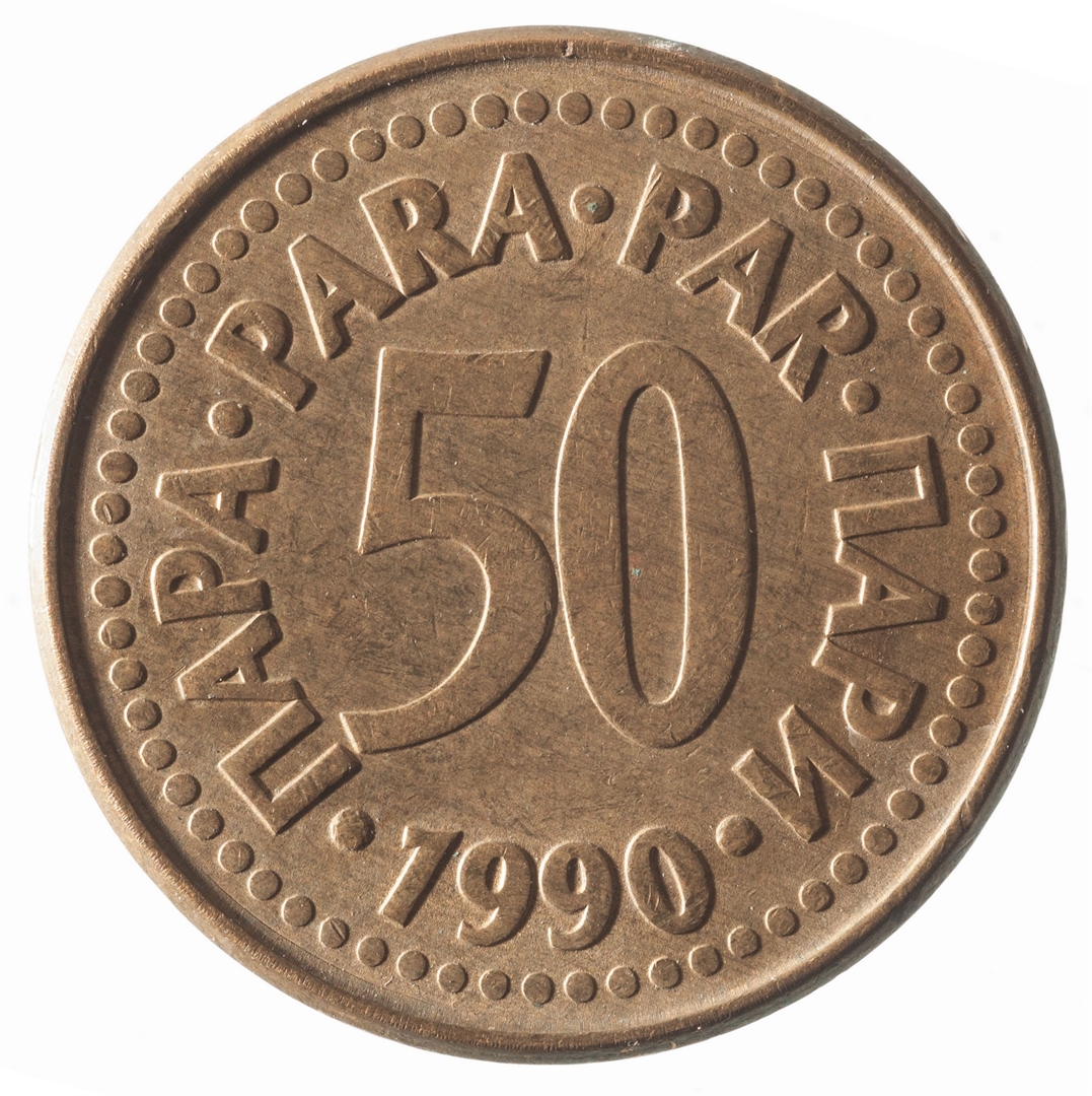 U sredini broj 50 (nominala), oko njega tekst PARA na četiri jezika, a ispod toga godina 1990.