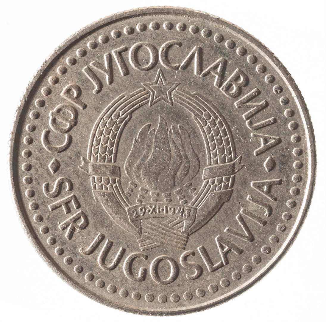 U sredini državni grb. Oko njega uz rub polukružno napisan tekst SFR JUGOSLAVIJA na latinici i ćirilici.