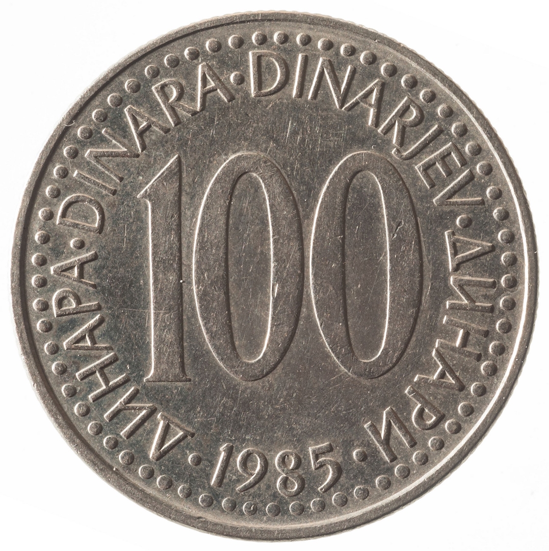 U sredini broj 100 (nominala), oko njega tekst DINAR na četiri jezika, a ispod toga godina 1985.