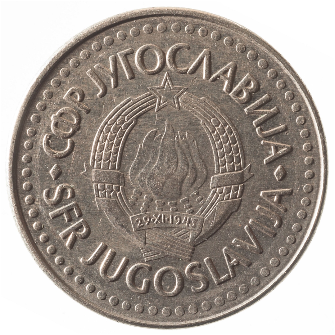 U sredini državni grb. Oko njega uz rub polukružno napisan tekst SFR JUGOSLAVIJA na latinici i ćirilici.