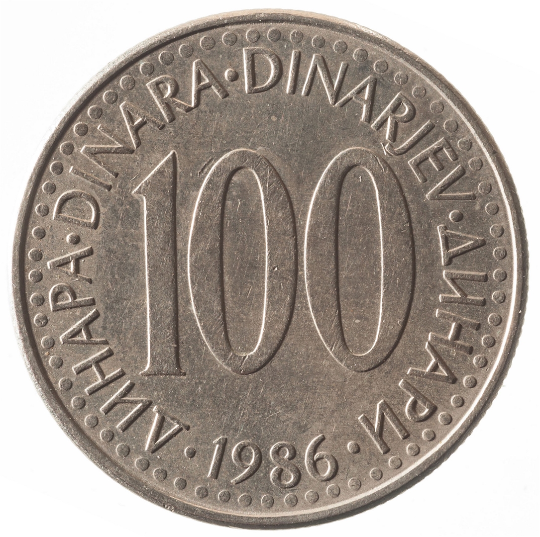 U sredini broj 100 (nominala), oko njega tekst DINAR na četiri jezika, a ispod toga godina 1986.
