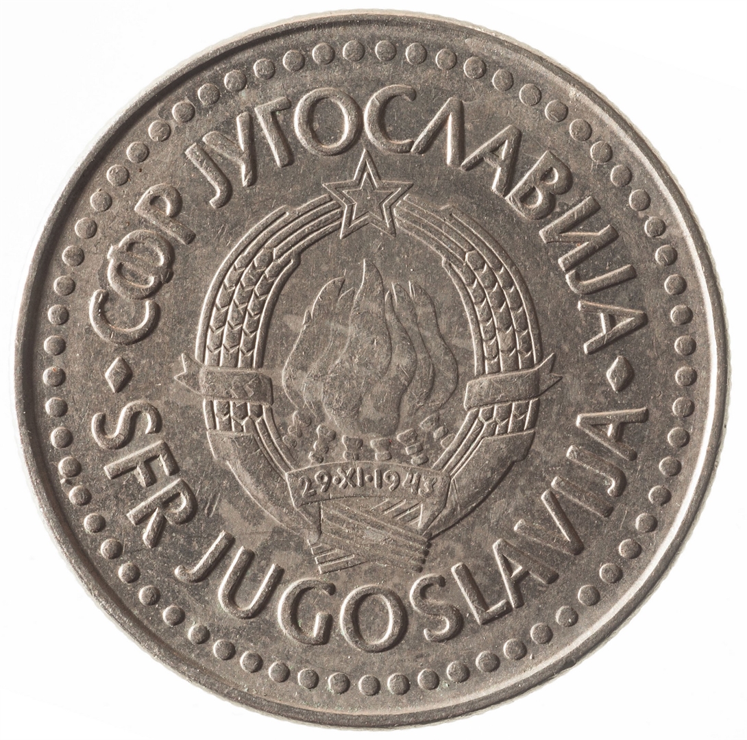 U sredini državni grb. Oko njega uz rub polukružno napisan tekst SFR JUGOSLAVIJA na latinici i ćirilici.