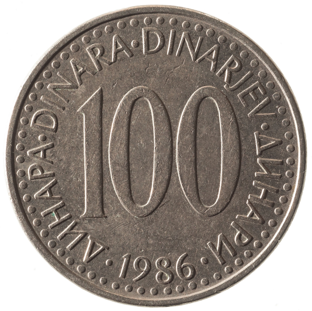 U sredini broj 100 (nominala), oko njega tekst DINAR na četiri jezika, a ispod toga godina 1986.