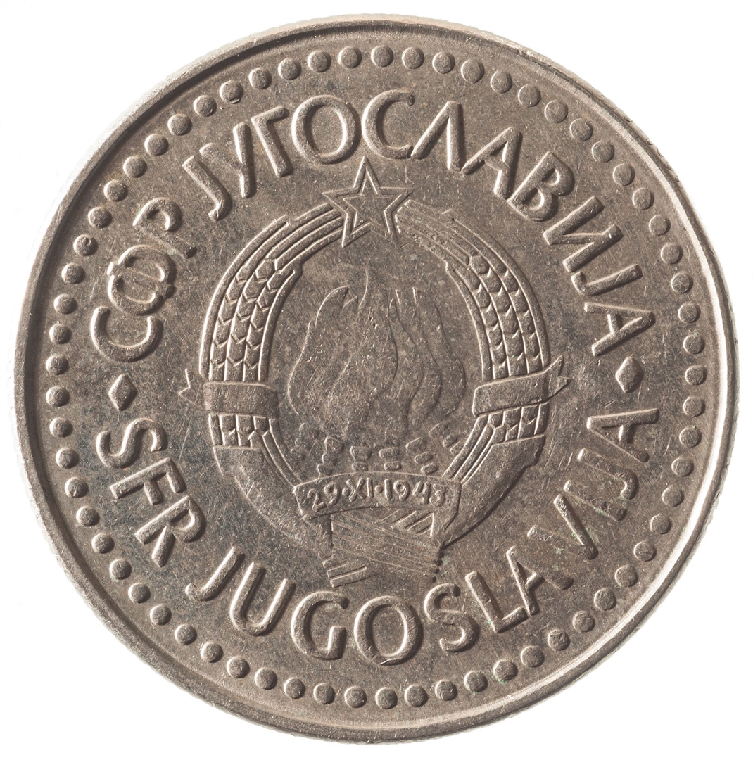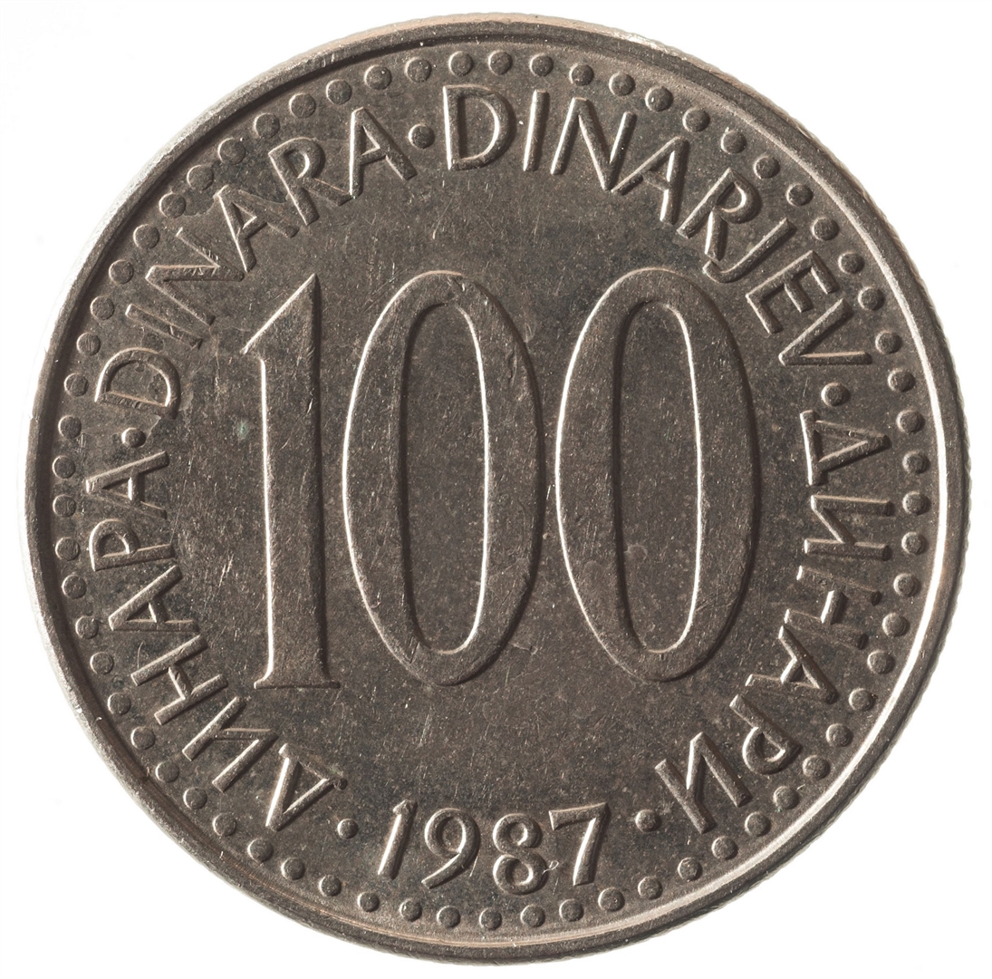 Avers: U sredini državni grb. Oko njega uz rub polukružno napisan tekst SFR JUGOSLAVIJA na latinici i ćirilici. Revers: U sredini broj 100 (nominala), oko njega tekst DINAR na četiri jezika, a ispod toga godina 1987.