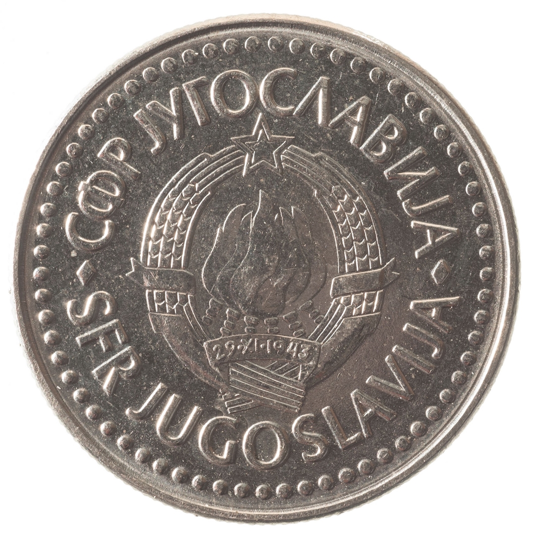 U sredini državni grb. Oko njega uz rub polukružno napisan tekst SFR JUGOSLAVIJA na latinici i ćirilici.