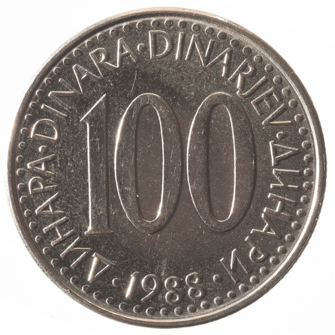 U sredini broj 100 (nominala), oko njega tekst DINAR na četiri jezika, a ispod toga godina 1988.