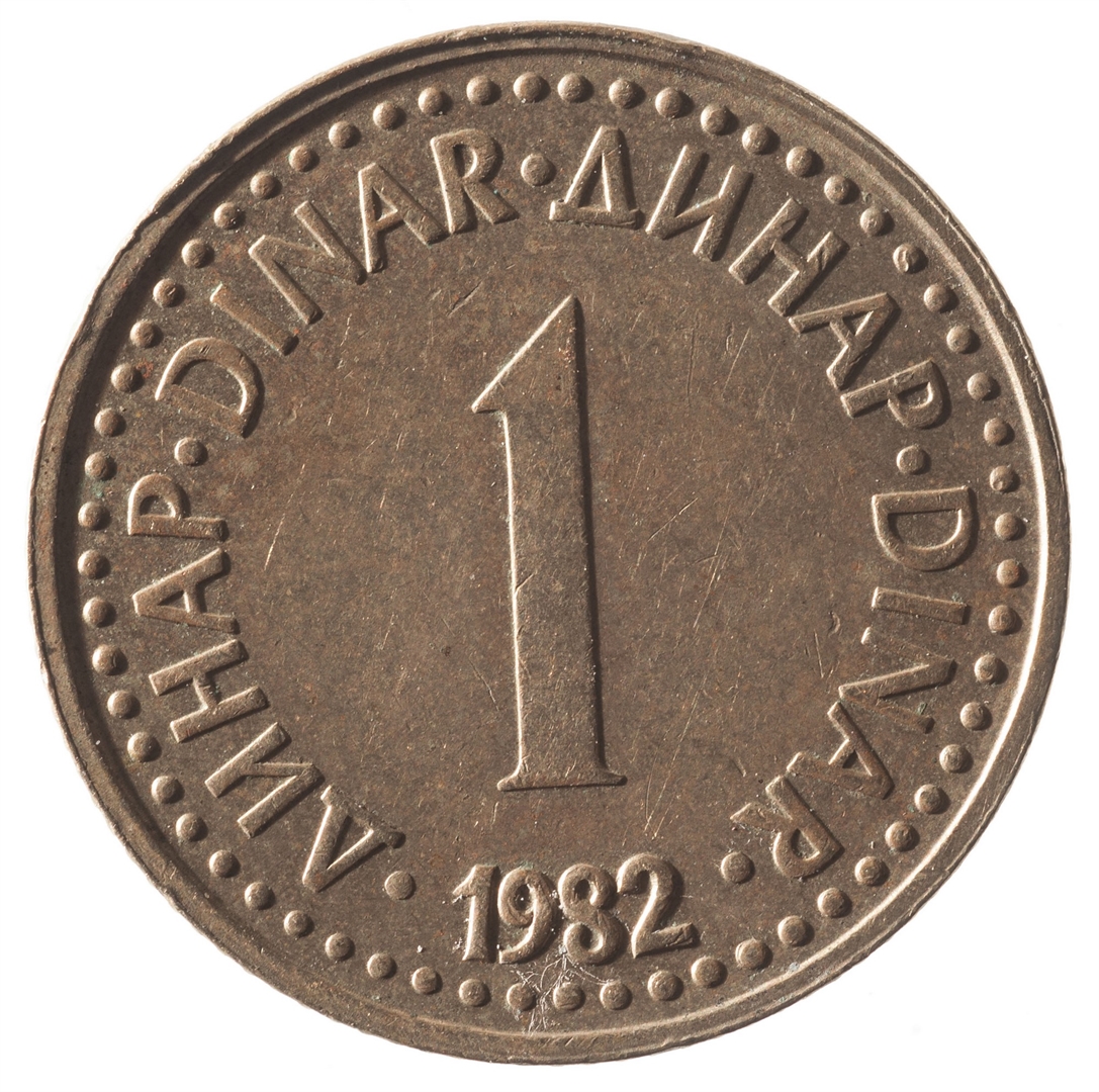 U sredini broj 1 (nominala), oko njega tekst DINAR na četiri jezika, a ispod toga godina 1982.
