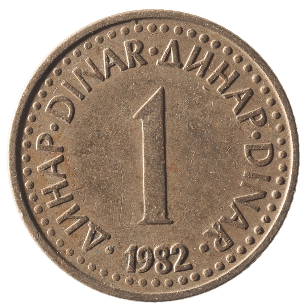 U sredini broj 1 (nominala), oko njega tekst DINAR na četiri jezika, a ispod toga godina 1982.