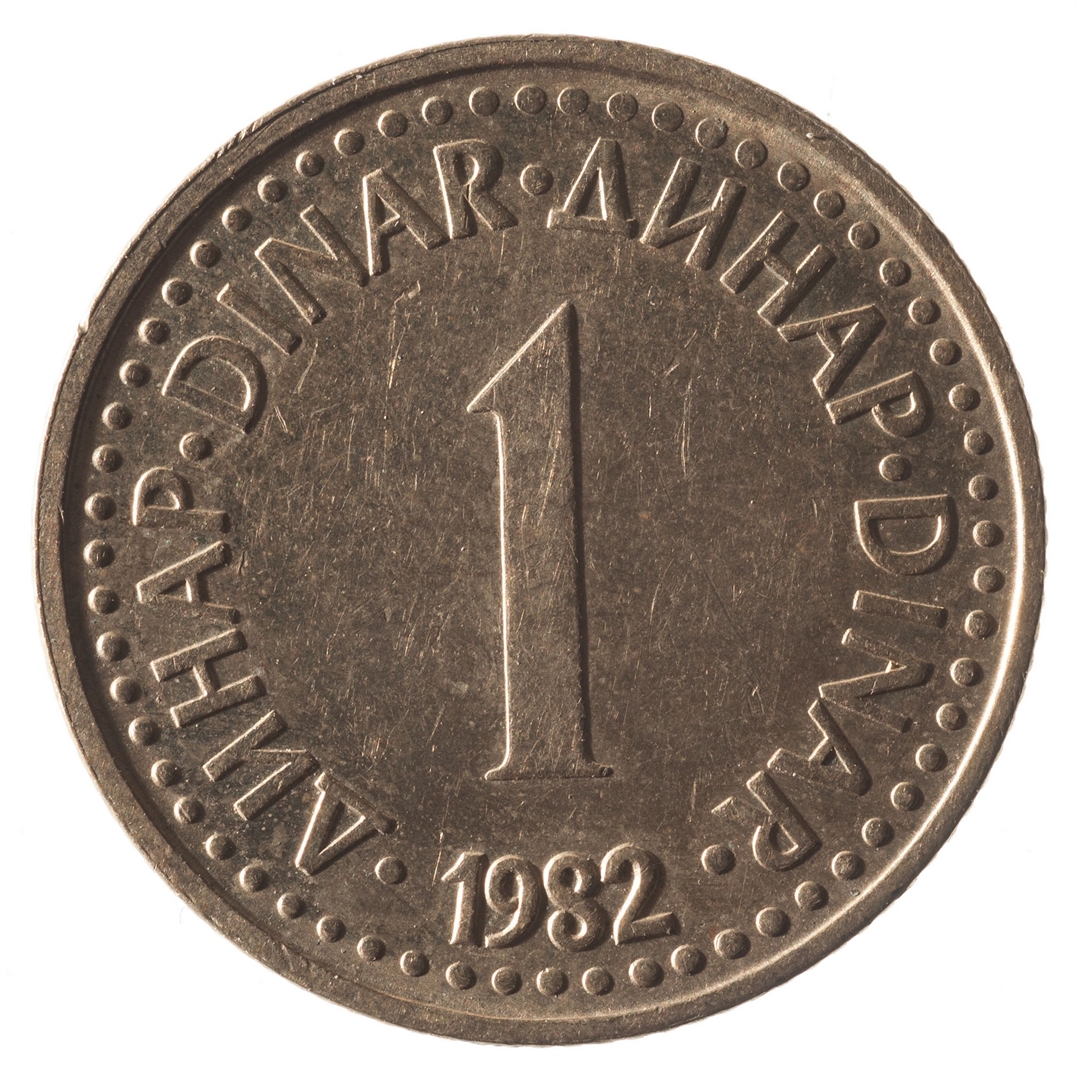 U sredini broj 1 (nominala), oko njega tekst DINAR na četiri jezika, a ispod toga godina 1982.