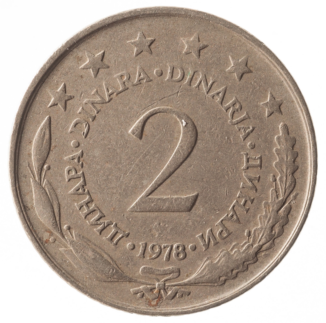 U sredini broj 2 (nominala), oko njega tekst DINAR na četiri jezika, a ispod toga godina 1978. Duž gornjeg ruba polukružno poredano 6 petokrakih zvjezdi.