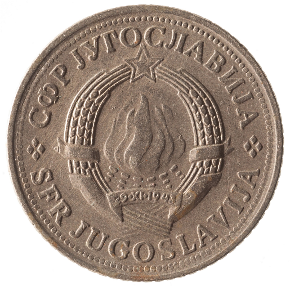 U sredini državni grb. U oko njega uz rub polukružno napisan tekst SFR JUGOSLAVIJA na latinici i ćirilici.