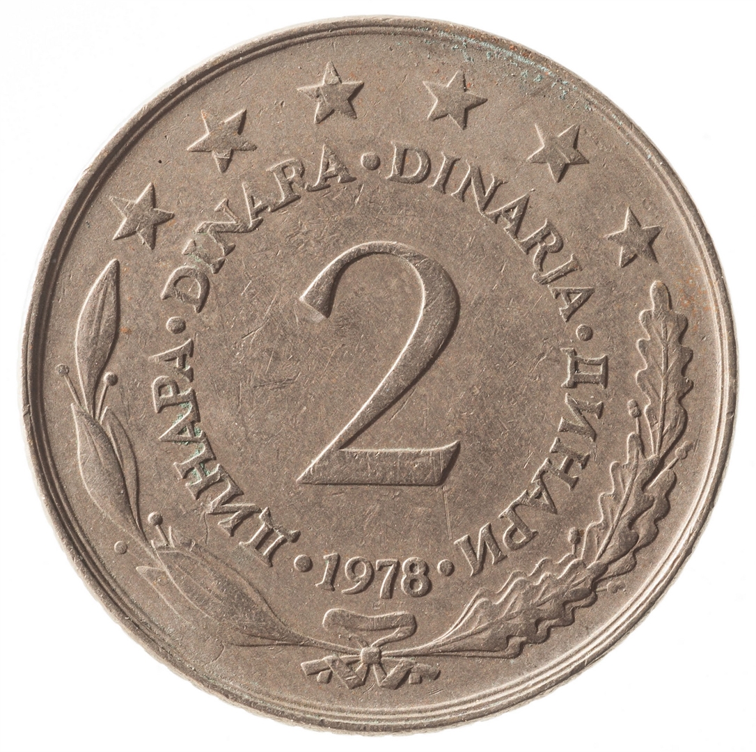 U sredini broj 2 (nominala), oko njega tekst DINAR na četiri jezika, a ispod toga godina 1978. Duž gornjeg ruba polukružno poredano 6 petokrakih zvjezdi.