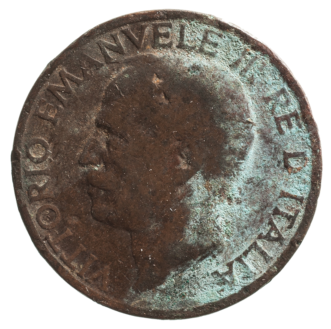 Centralni dio kovanice zauzima profil muške osobe sa pogledom u lijevo. Kružno uz rub kovanice proteže se natpis VITTORIO. EMANUELE. III. RE. D''ITALIA. Na dnu uz rub kovanice nalazi se natpis A. MOTTI.