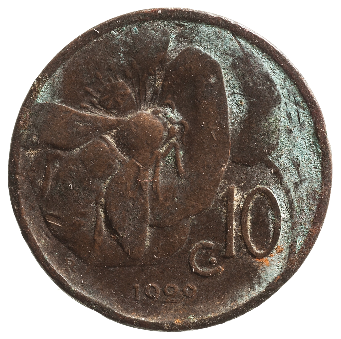 Dvije trećine površine zauzima prikaz pčele na cvijetu. Uz desni doljnji rub kovanice nalazi se natpis c10, a uz lijevi donji rub veliko slovo R. Na samon dnu nalazi se godina 1929.