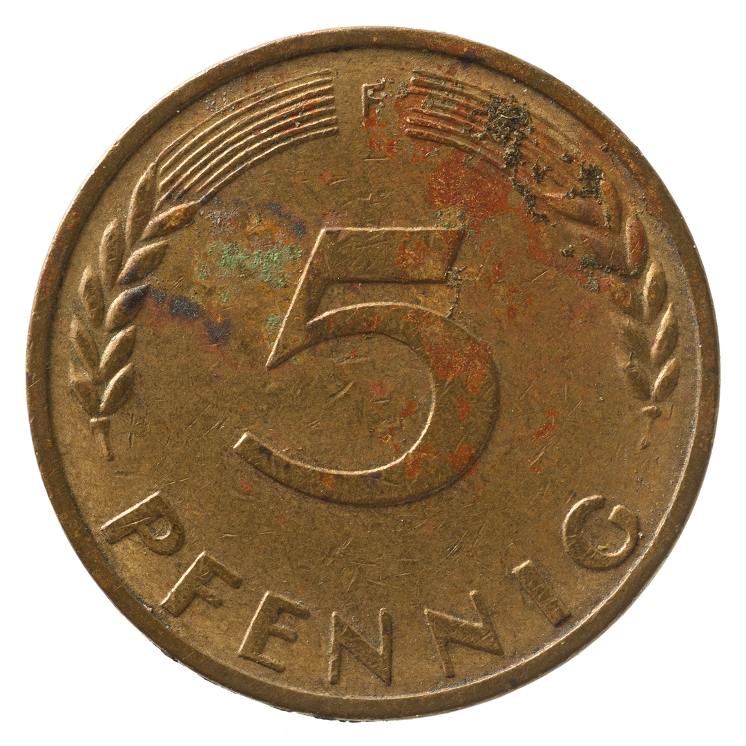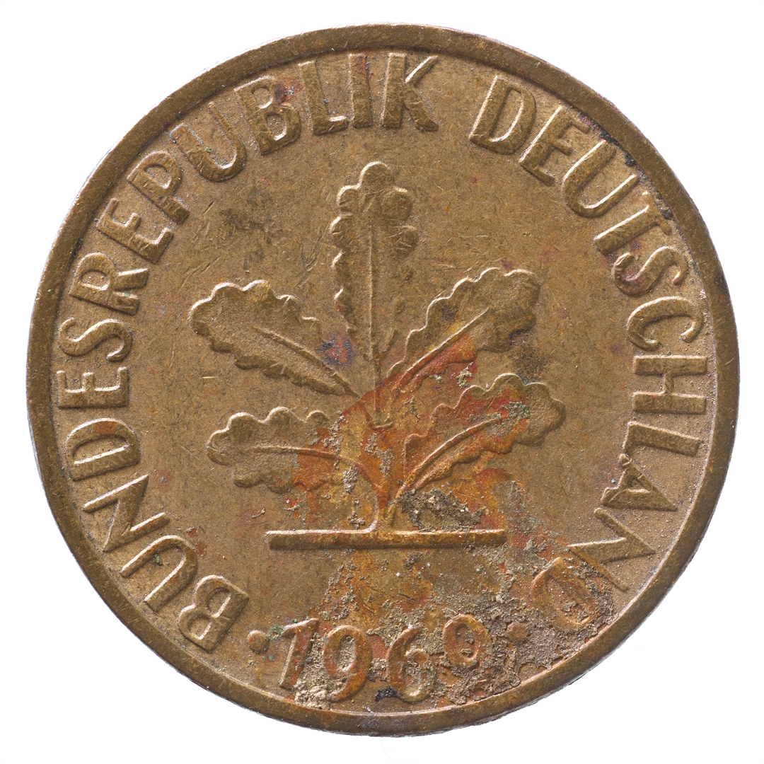 Avers: U sredini mladica hrasta s pet listova u vodoravnoj liniji. Uz rub ispisan tekst BUNDESREPUBLIK DEUTSCHLAND i godina 1969. Revers: U sredini broj 5. Na vrhu slovo F (oznaka kovnice), a uz donji rub riječ PFENNIG.