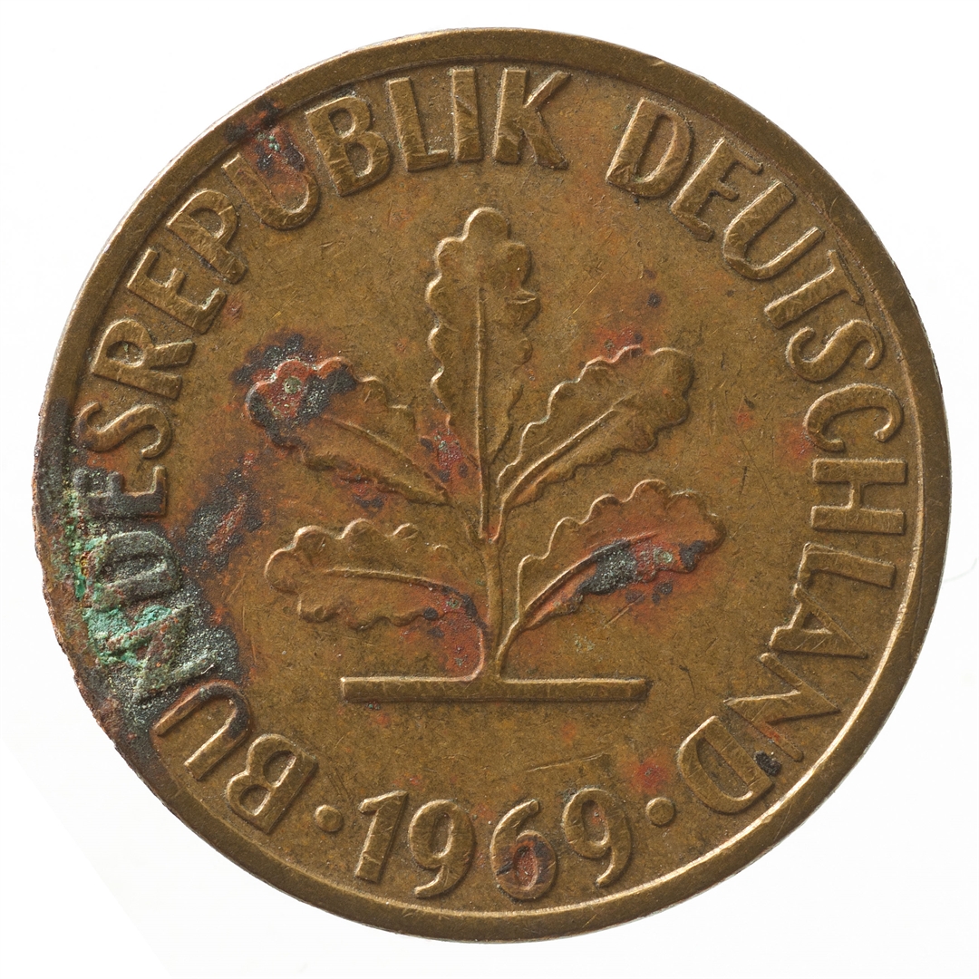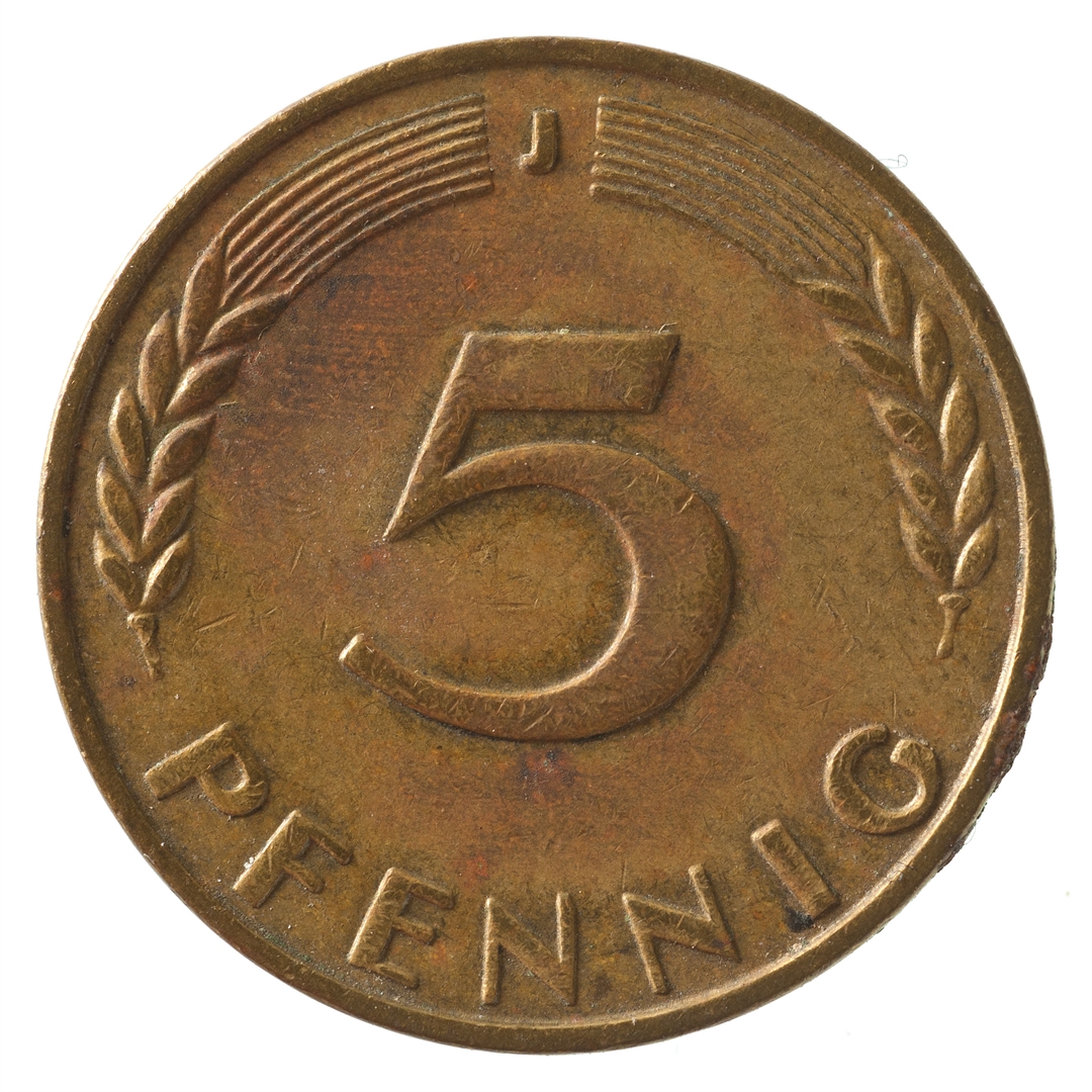 Avers: U sredini mladica hrasta s pet listova u vodoravnoj liniji. Uz rub ispisan tekst BUNDESREPUBLIK DEUTSCHLAND i godina 1969. Revers: U sredini broj 5. Na vrhu slovo J (oznaka kovnice), a uz donji rub riječ PFENNIG.