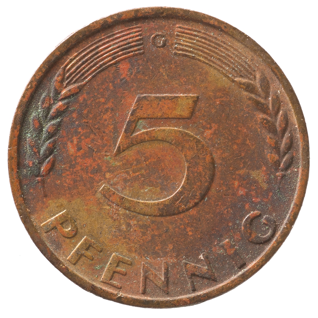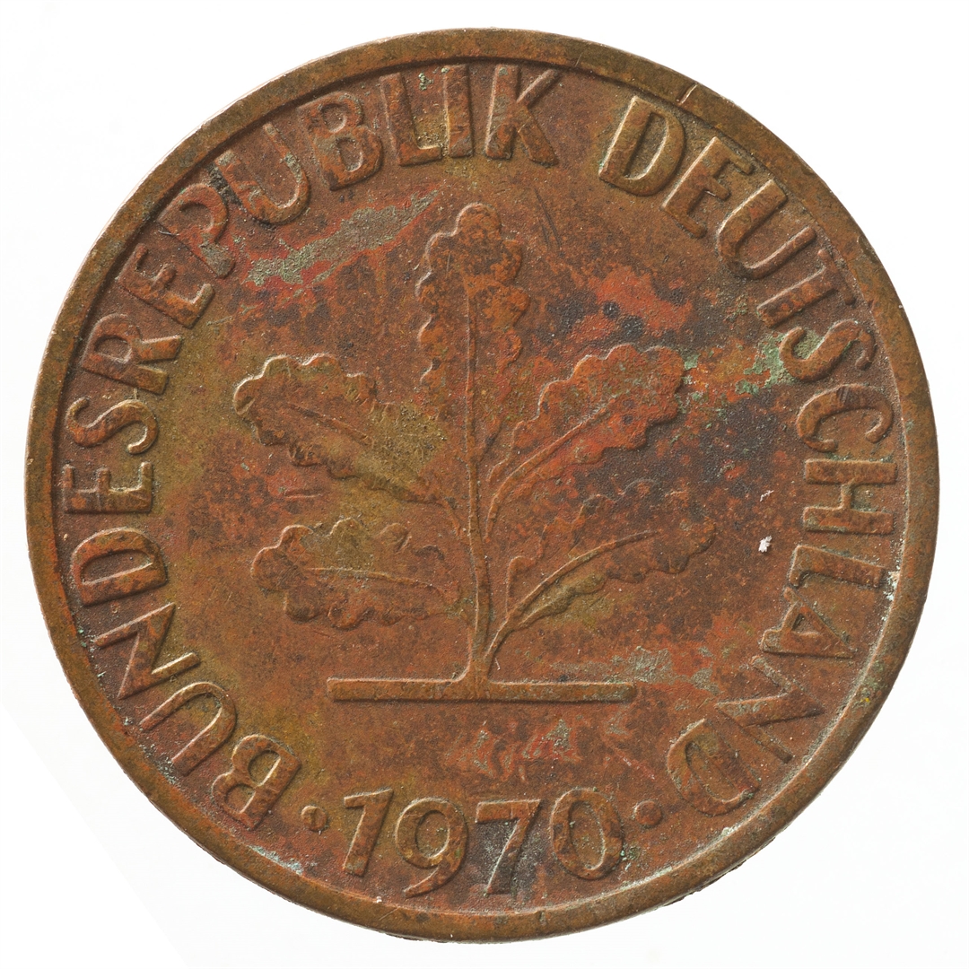 Avers: U sredini mladica hrasta s pet listova u vodoravnoj liniji. Uz rub ispisan tekst BUNDESREPUBLIK DEUTSCHLAND i godina 1970. Revers: U sredini broj 5. Na vrhu slovo G (oznaka kovnice), a uz donji rub riječ PFENNIG.