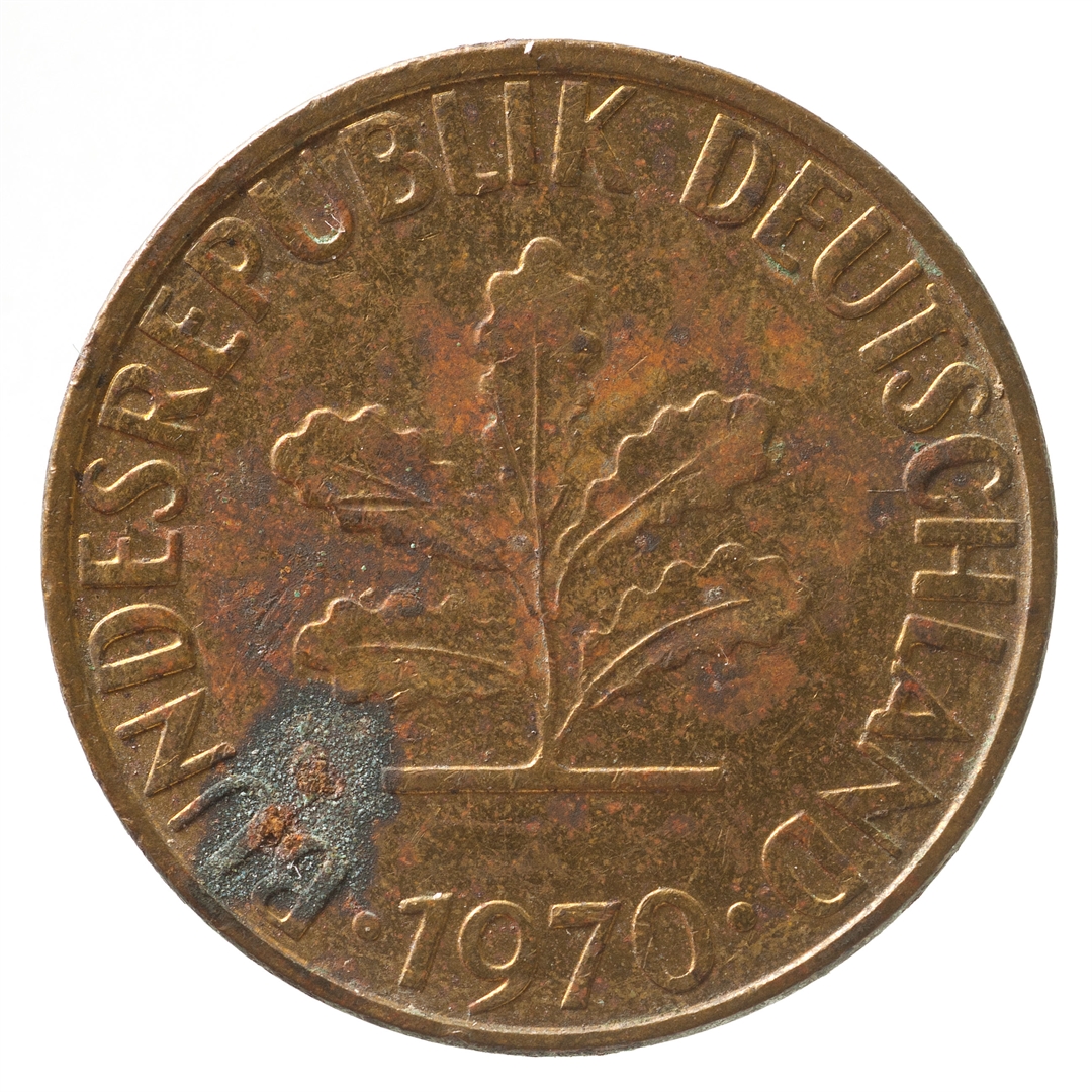 U sredini mladica hrasta s pet listova u vodoravnoj liniji. Uz rub ispisan tekst BUNDESREPUBLIK DEUTSCHLAND i godina 1970.