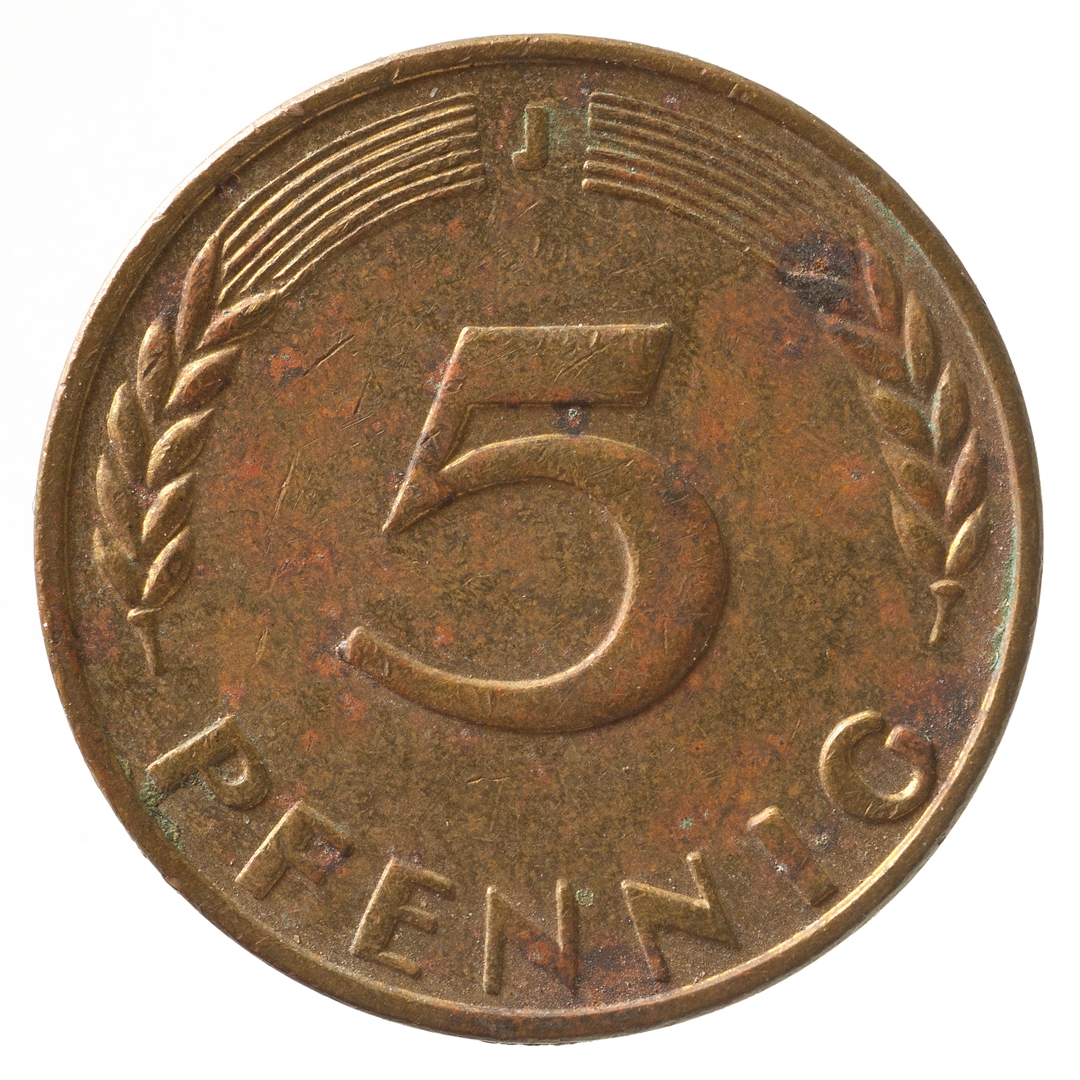 U sredini broj 5. Na vrhu slovo J (oznaka kovnice), a uz donji rub riječ PFENNIG.