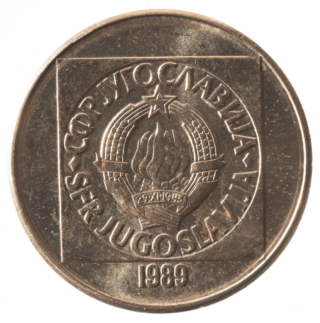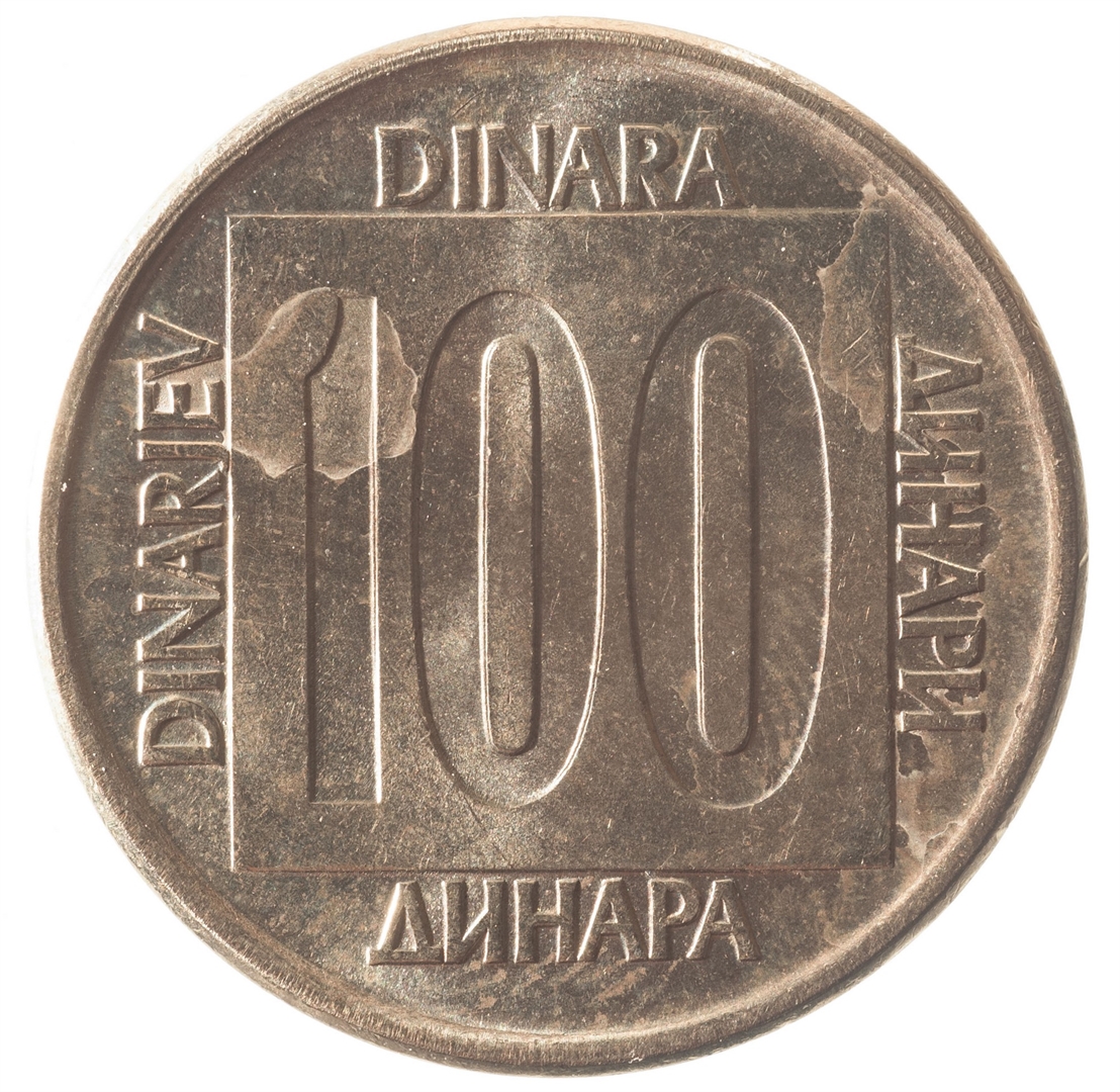 Avers: U sredini unutar četverokuta državni grb, a oko njega uz rub polukružno napisan tekst SFR JUGOSLAVIJA na latinici i ćirilici. Ispod godina 1989. Revers: U sredini četverokuta broj 100 (nominala), oko njega tekst DINAR na četiri jezika.