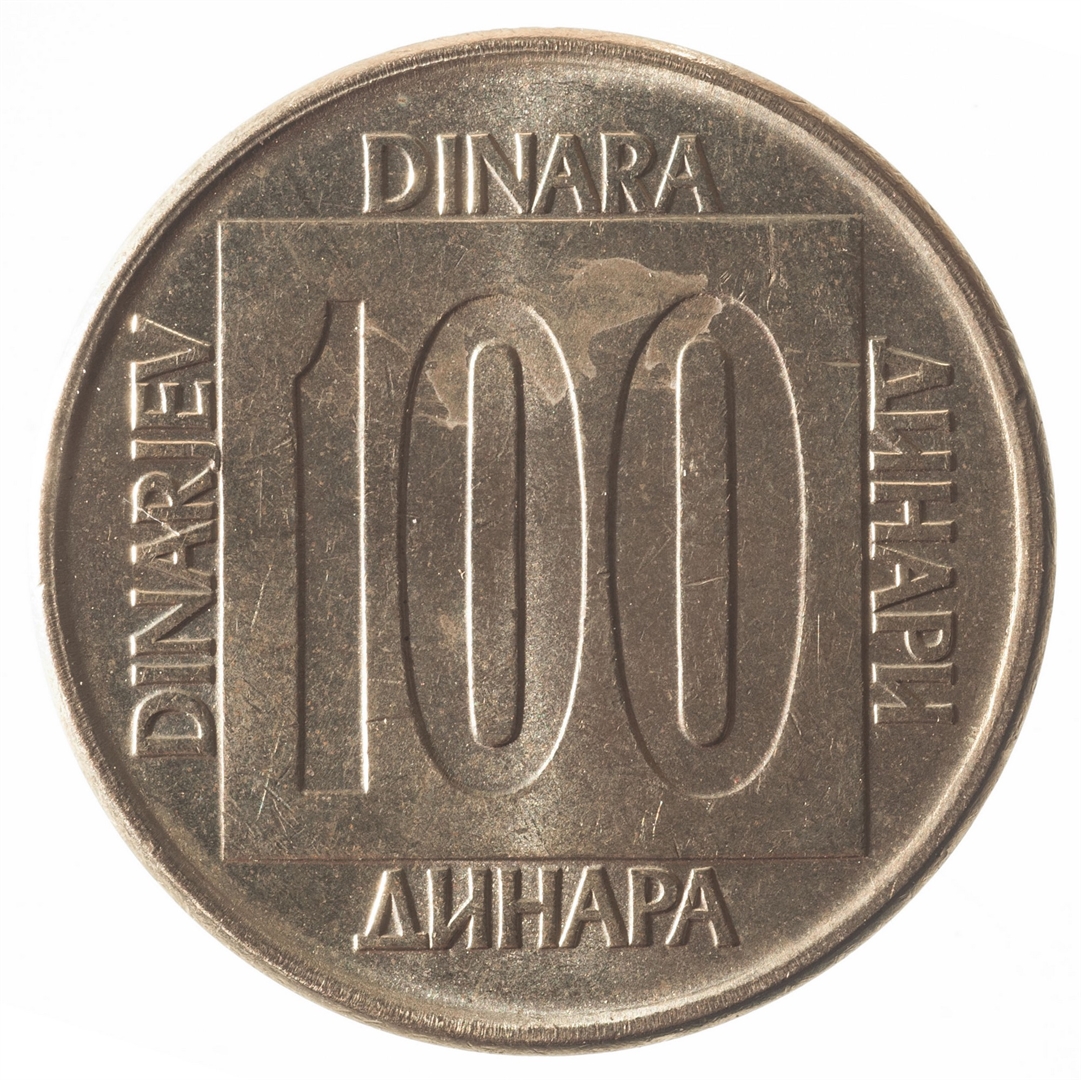 U sredini četverokuta broj 100 (nominala), oko njega tekst DINAR na četiri jezika.