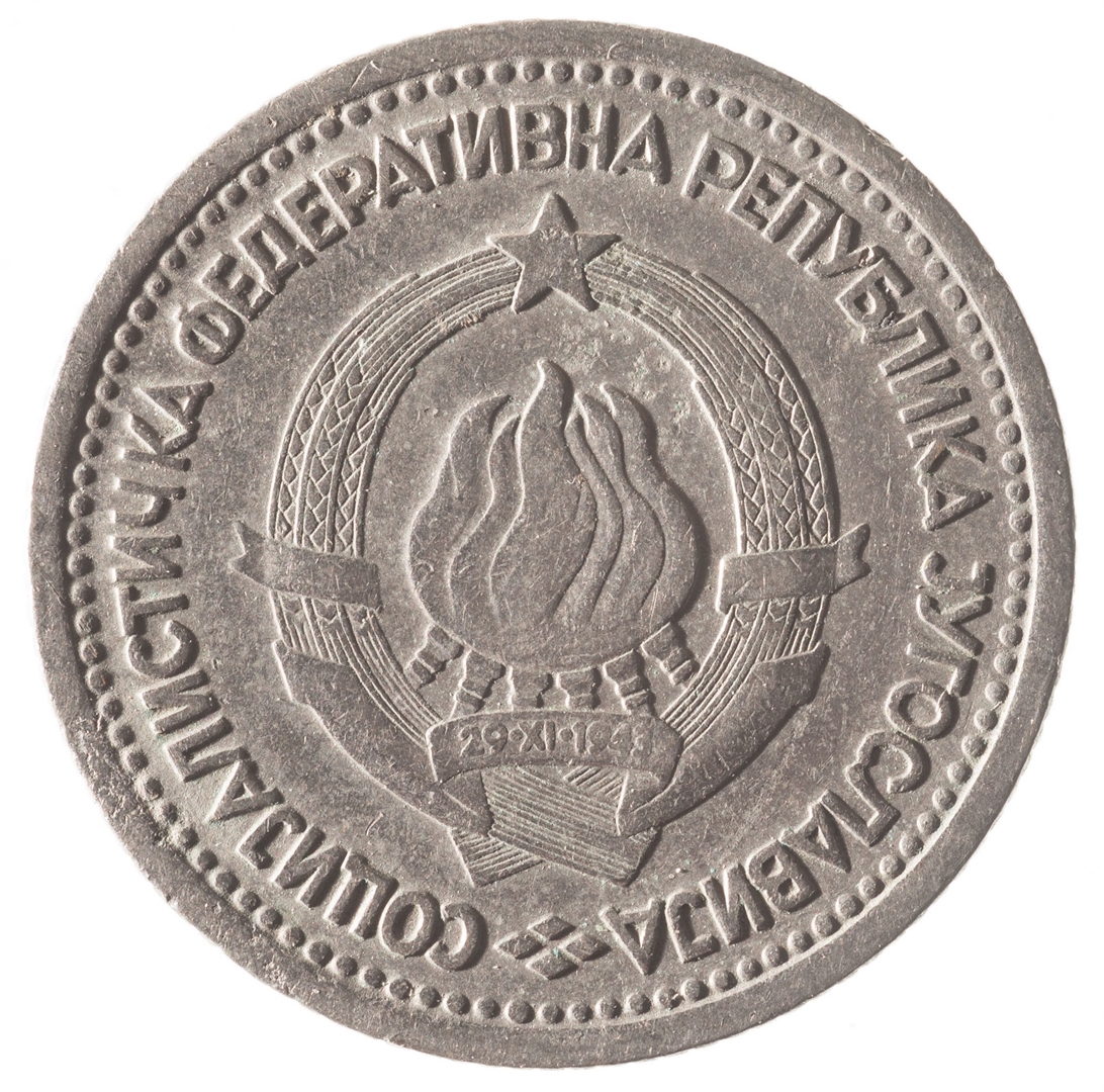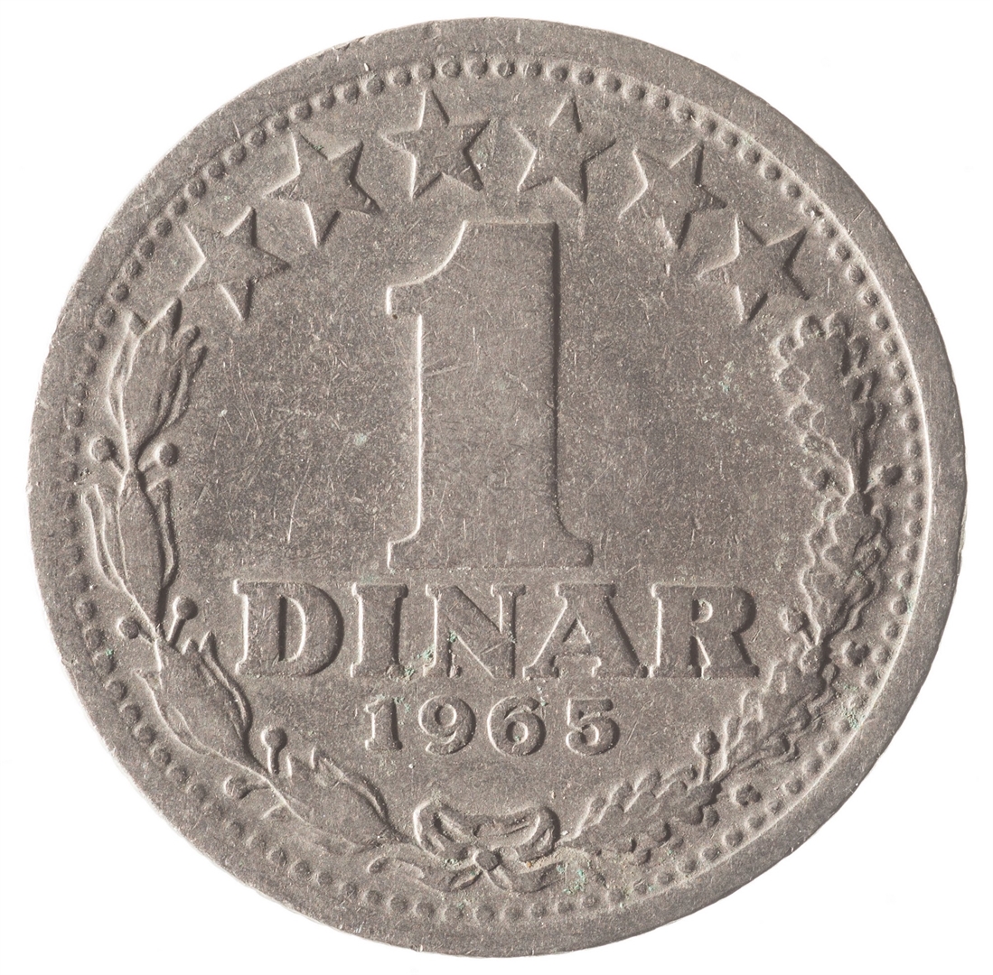 U sredini broj 1 (nominala), a ispod njega tekst DINARA i godina 1965. Duž cijelog gornjeg ruba polukružno poredano 6 petokrakih zvjezdi.
