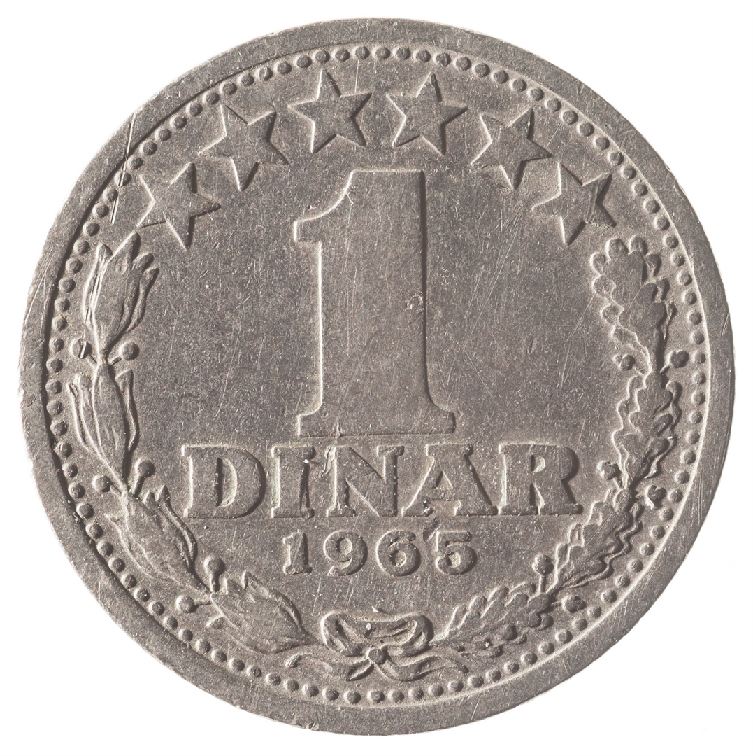 U sredini broj 1 (nominala), a ispod njega tekst DINARA i godina 1965. Duž cijelog gornjeg ruba polukružno poredano 6 petokrakih zvjezdi.