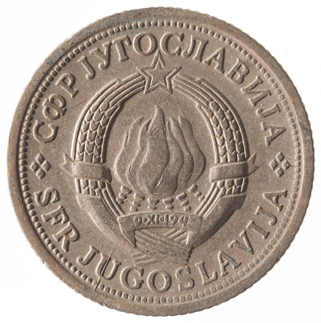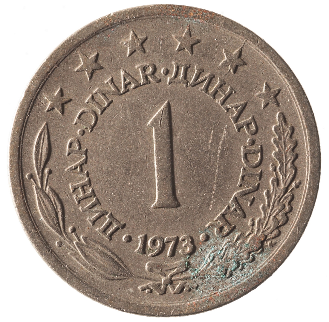 U sredini broj 1 (nominala), oko njega tekst DINAR na četiri jezika, a ispod toga godina 1973. Duž gornjeg ruba polukružno poredano 6 petokrakih zvjezdi.