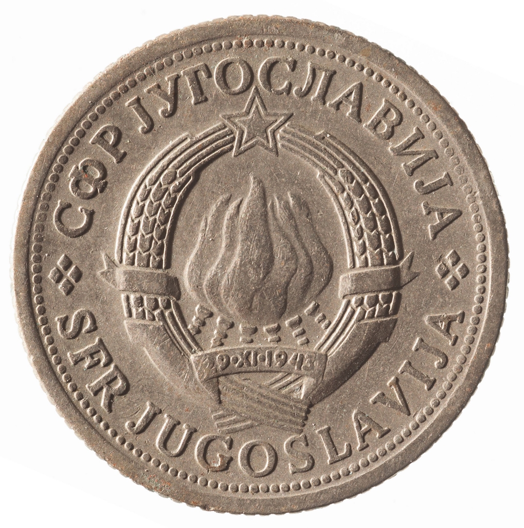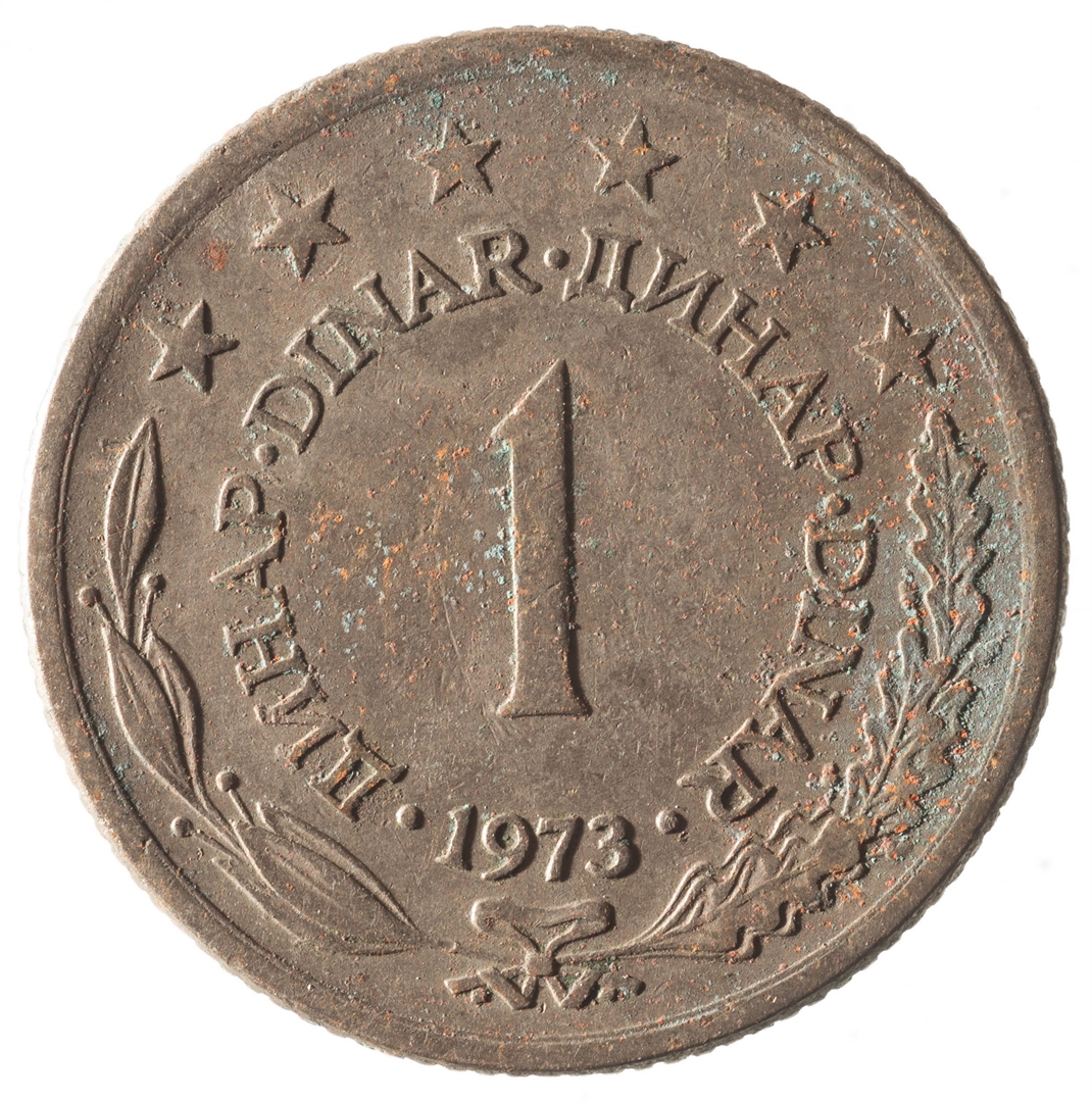 U sredini broj 1 (nominala), oko njega tekst DINAR na četiri jezika, a ispod toga godina 1973. Duž gornjeg ruba polukružno poredano 6 petokrakih zvjezdi.