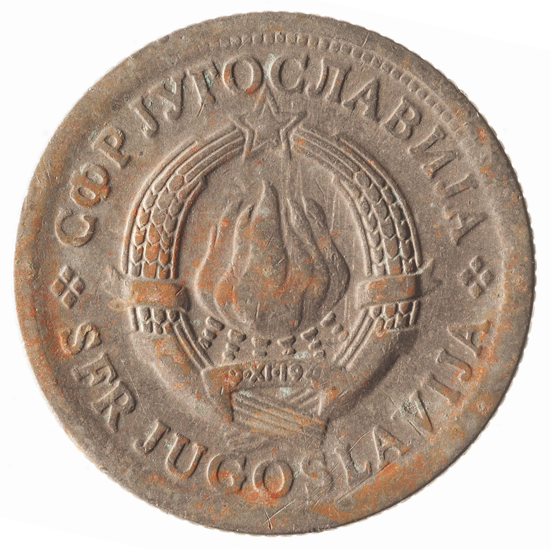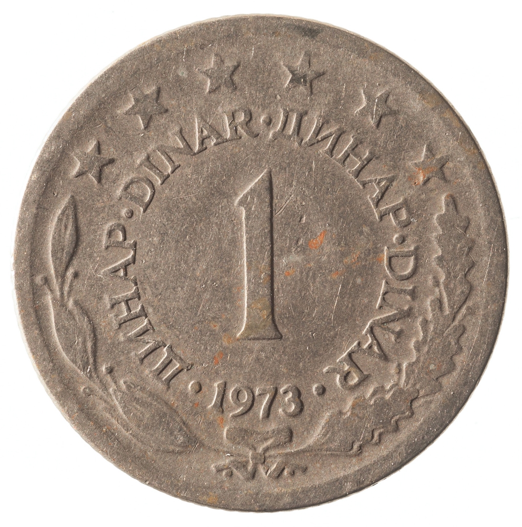 Avers: U sredini državni grb. U gornjem djelu uz rub polukružno napisan tekst SFR JUGOSLAVIJA na latinici i ćirilici. Revers: U sredini broj 1 (nominala), oko njega tekst DINAR na četiri jezika, a ispod toga godina 1973. Duž gornjeg ruba polukružno poredano 6 petokrakih zvjezdi.