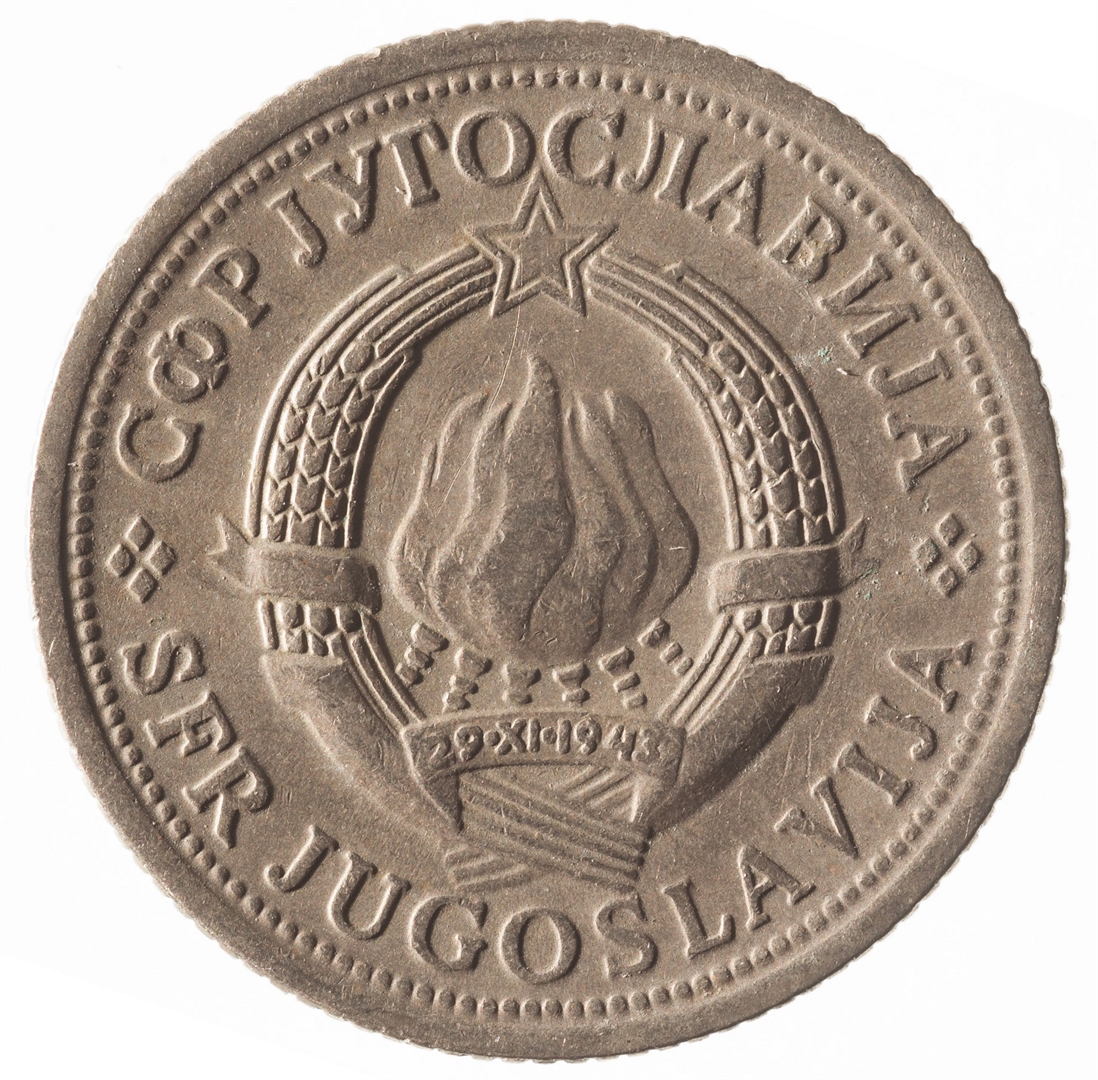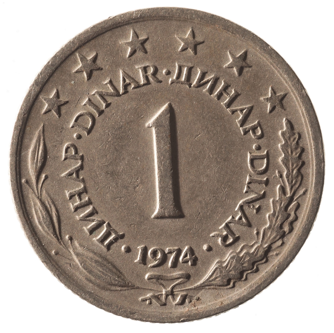 U sredini broj 1 (nominala), oko njega tekst DINAR na četiri jezika, a ispod toga godina 1974. Duž gornjeg ruba polukružno poredano 6 petokrakih zvjezdi.