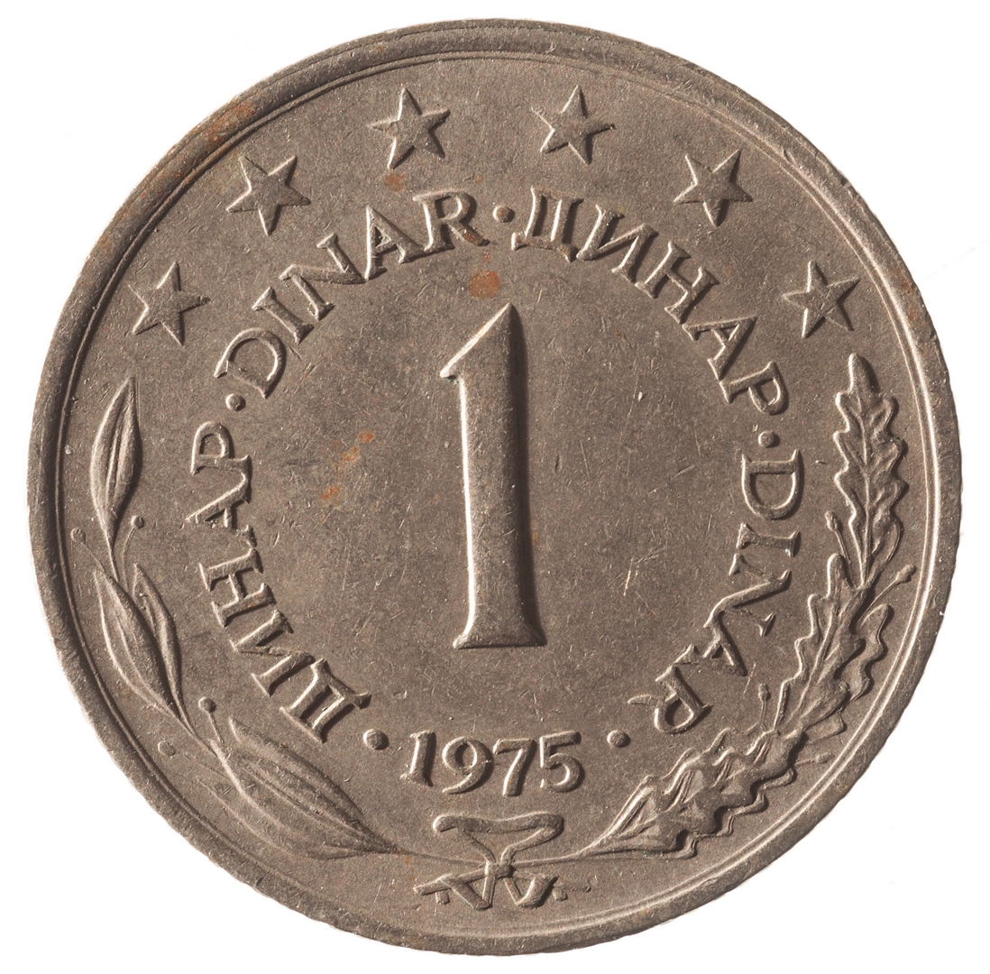 U sredini broj 1 (nominala), oko njega tekst DINAR na četiri jezika, a ispod toga godina 1975. Duž gornjeg ruba polukružno poredano 6 petokrakih zvjezdi.