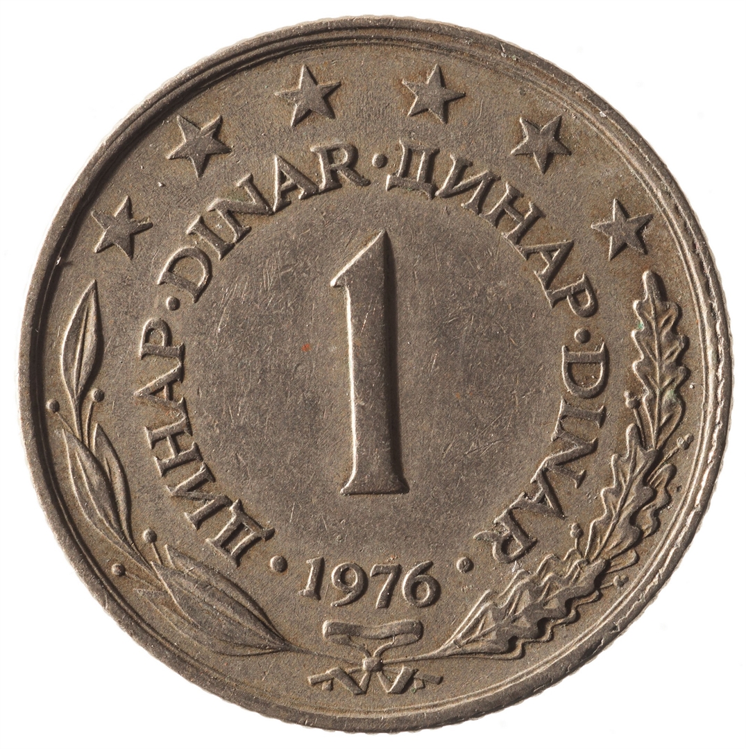 U sredini broj 1 (nominala), oko njega tekst DINAR na četiri jezika, a ispod toga godina 1976. Duž gornjeg ruba polukružno poredano 6 petokrakih zvjezdi.