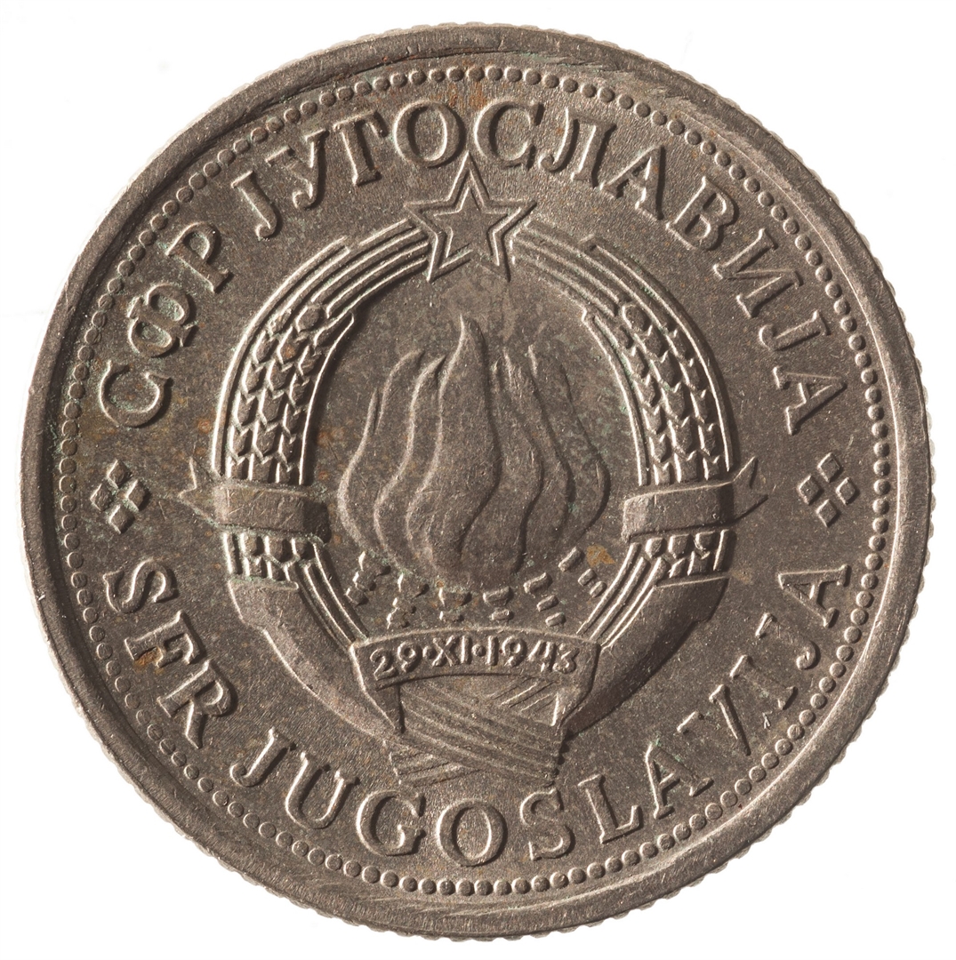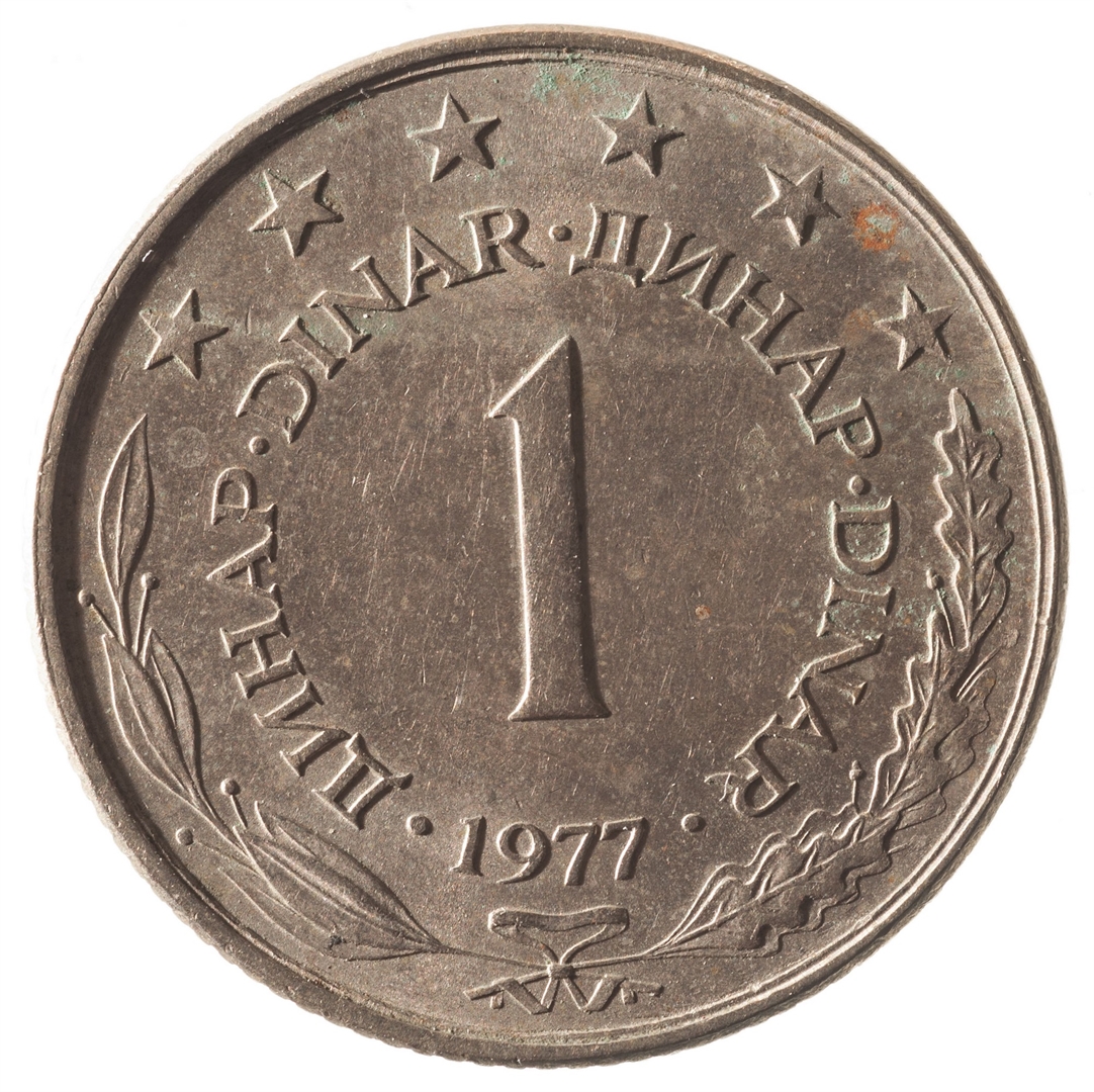 Avers: U sredini državni grb. U gornjem djelu uz rub polukružno napisan tekst SFR JUGOSLAVIJA na latinici i ćirilici. Revers: U sredini broj 1 (nominala), oko njega tekst DINAR na četiri jezika, a ispod toga godina 1977. Duž gornjeg ruba polukružno poredano 6 petokrakih zvjezdi.
