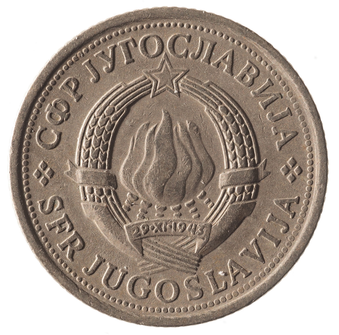 U sredini broj 1 (nominala), oko njega tekst DINAR na četiri jezika, a ispod toga godina 1977. Duž gornjeg ruba polukružno poredano 6 petokrakih zvjezdi.