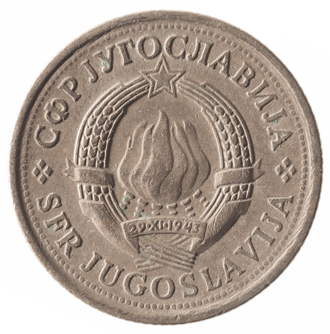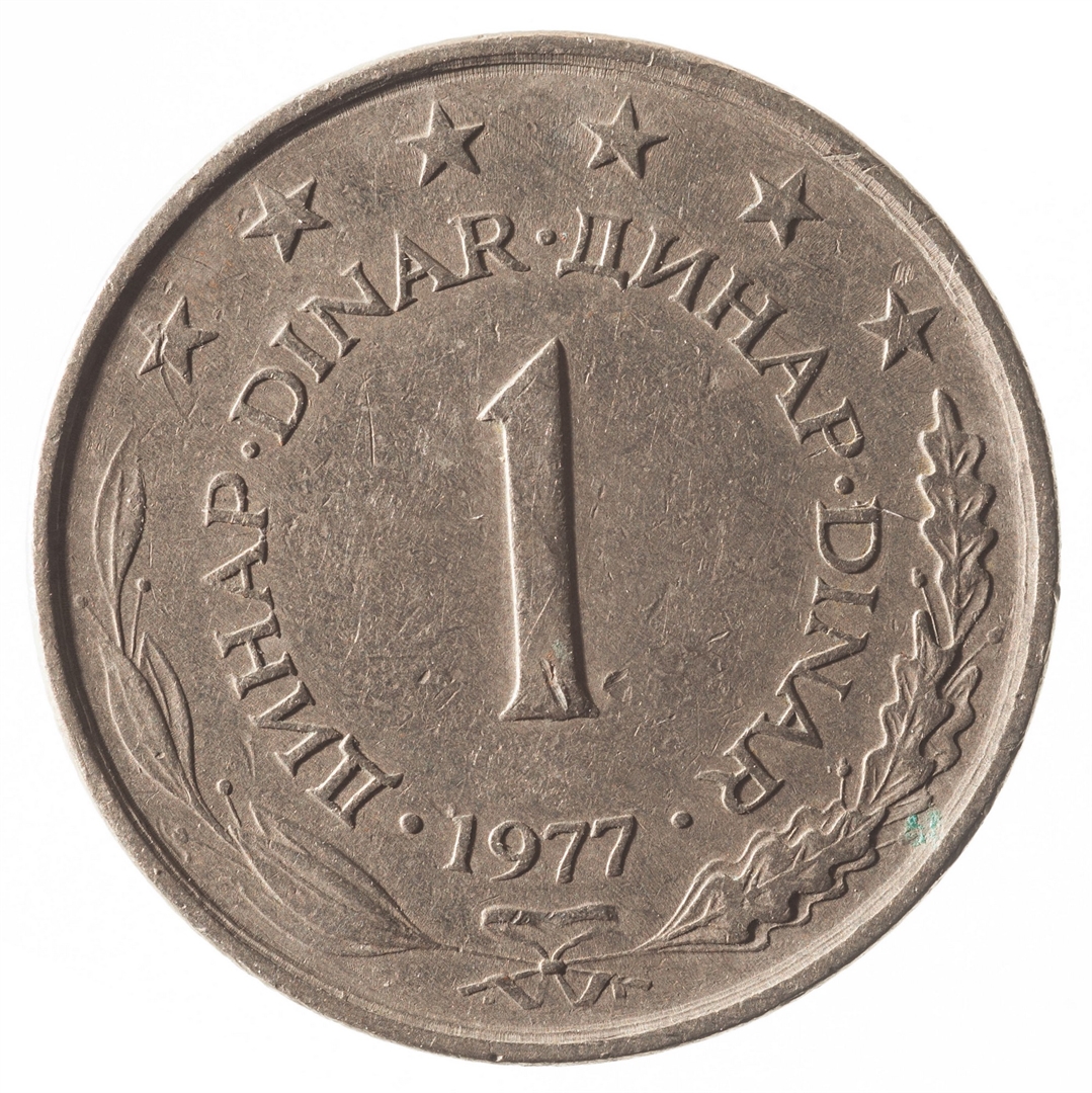 U sredini broj 1 (nominala), oko njega tekst DINAR na četiri jezika, a ispod toga godina 1977. Duž gornjeg ruba polukružno poredano 6 petokrakih zvjezdi.
