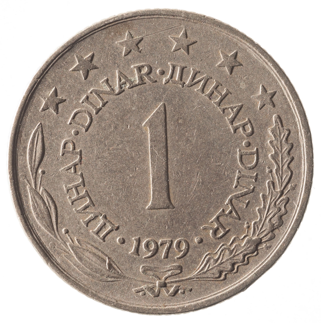 U sredini broj 1 (nominala), oko njega tekst DINAR na četiri jezika, a ispod toga godina 1979. Duž gornjeg ruba polukružno poredano 6 petokrakih zvjezdi.