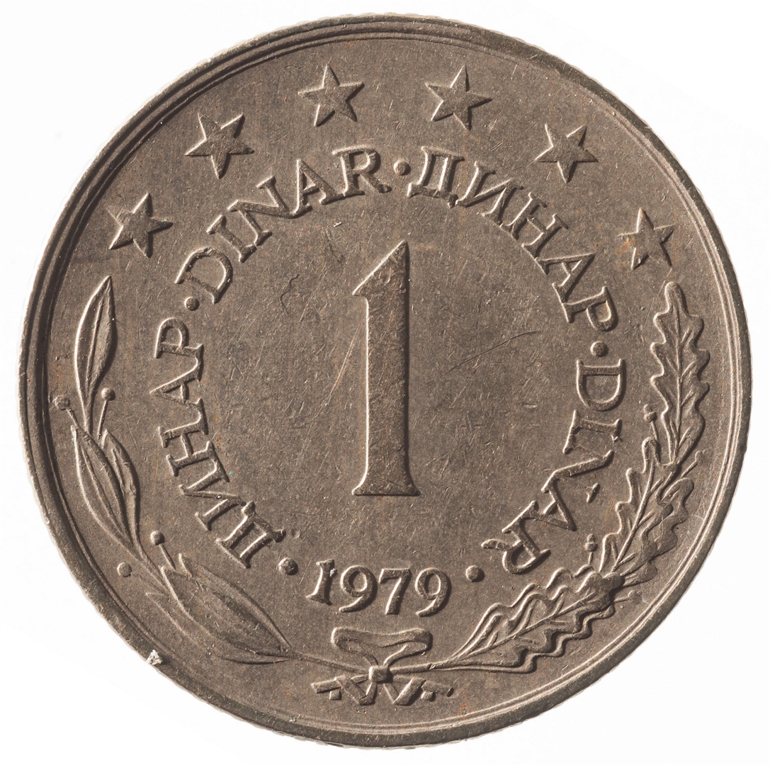 U sredini broj 1 (nominala), oko njega tekst DINAR na četiri jezika, a ispod toga godina 1979. Duž gornjeg ruba polukružno poredano 6 petokrakih zvjezdi.