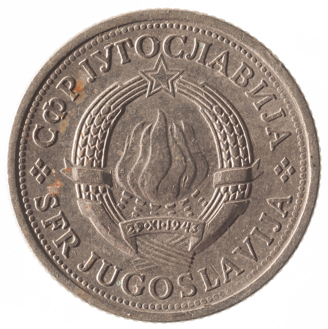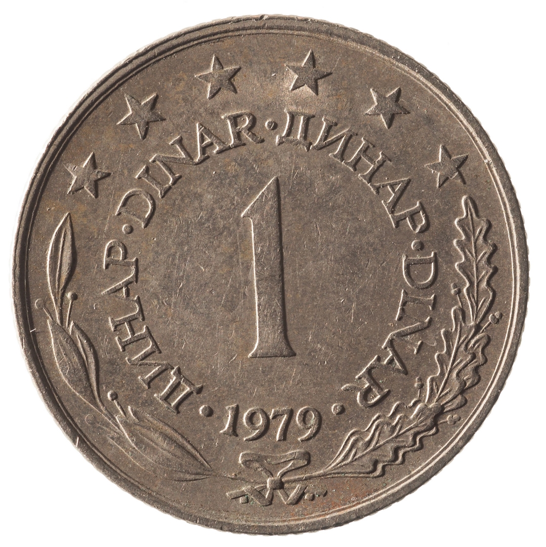 U sredini broj 1 (nominala), oko njega tekst DINAR na četiri jezika, a ispod toga godina 1979. Duž gornjeg ruba polukružno poredano 6 petokrakih zvjezdi.