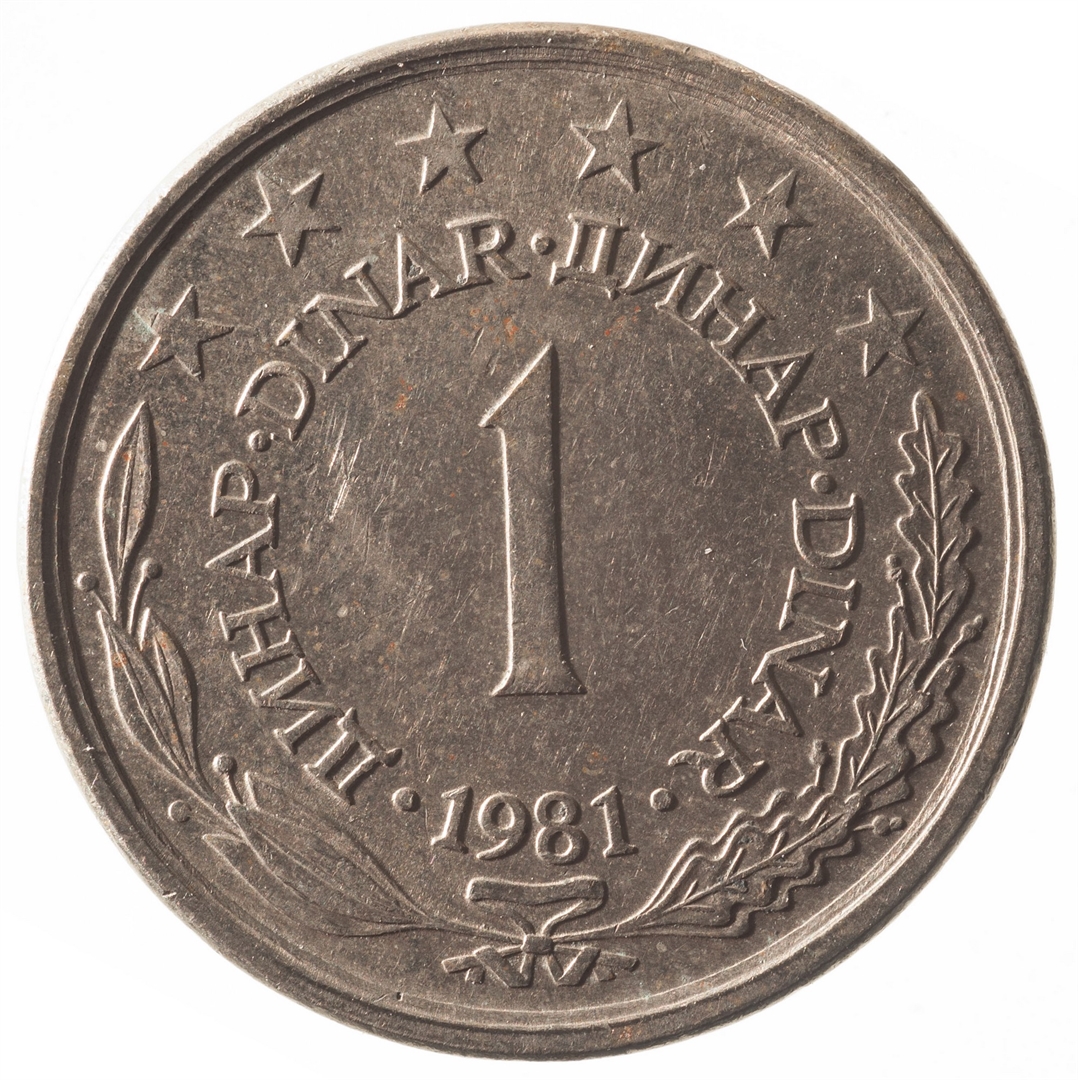 U sredini broj 1 (nominala), oko njega tekst DINAR na četiri jezika, a ispod toga godina 1981. Duž gornjeg ruba polukružno poredano 6 petokrakih zvjezdi.