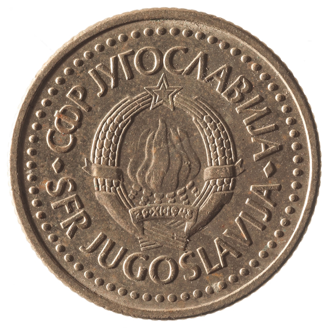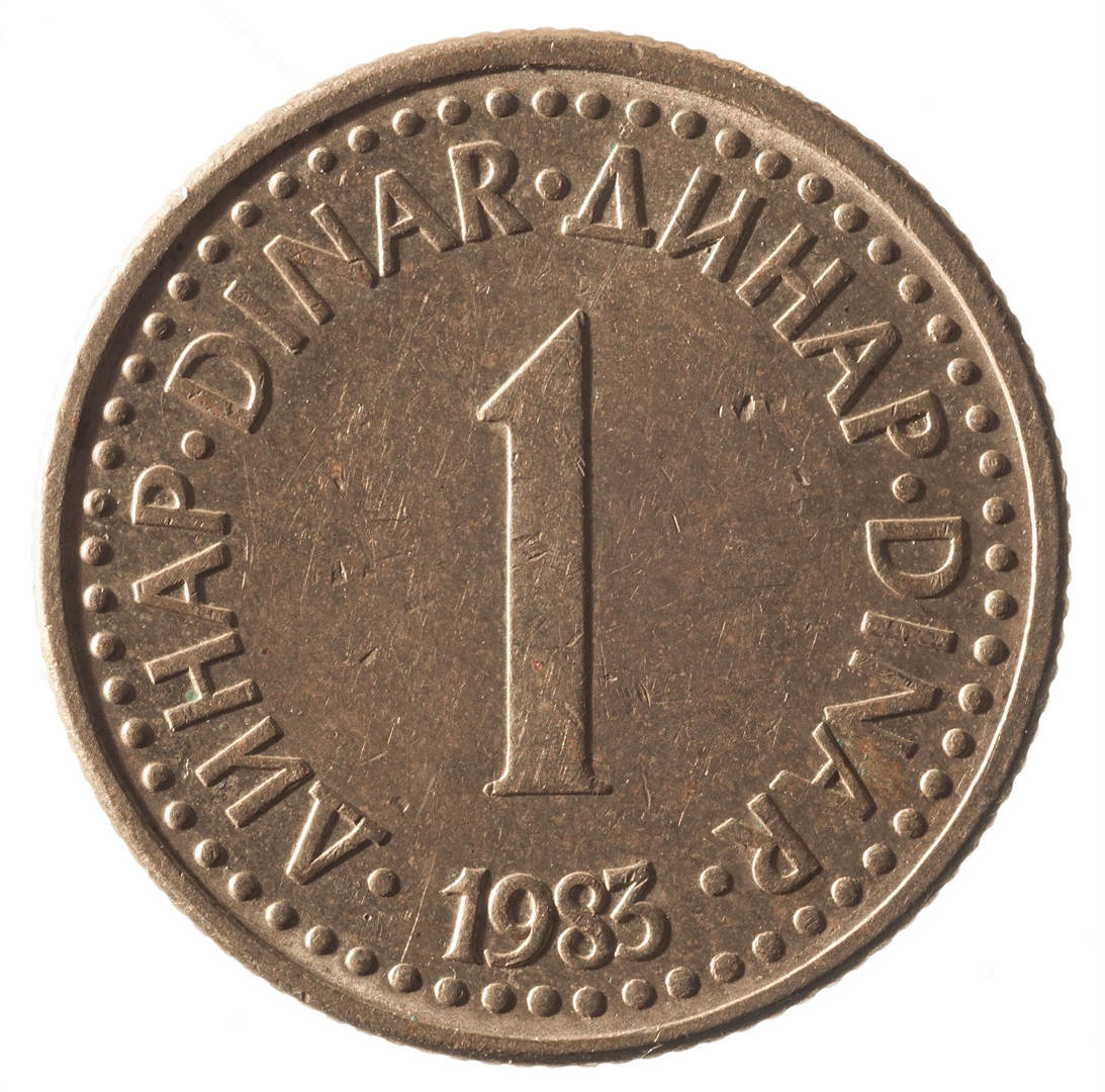 U sredini broj 1 (nominala), oko njega tekst DINAR na četiri jezika, a ispod toga godina 1983.