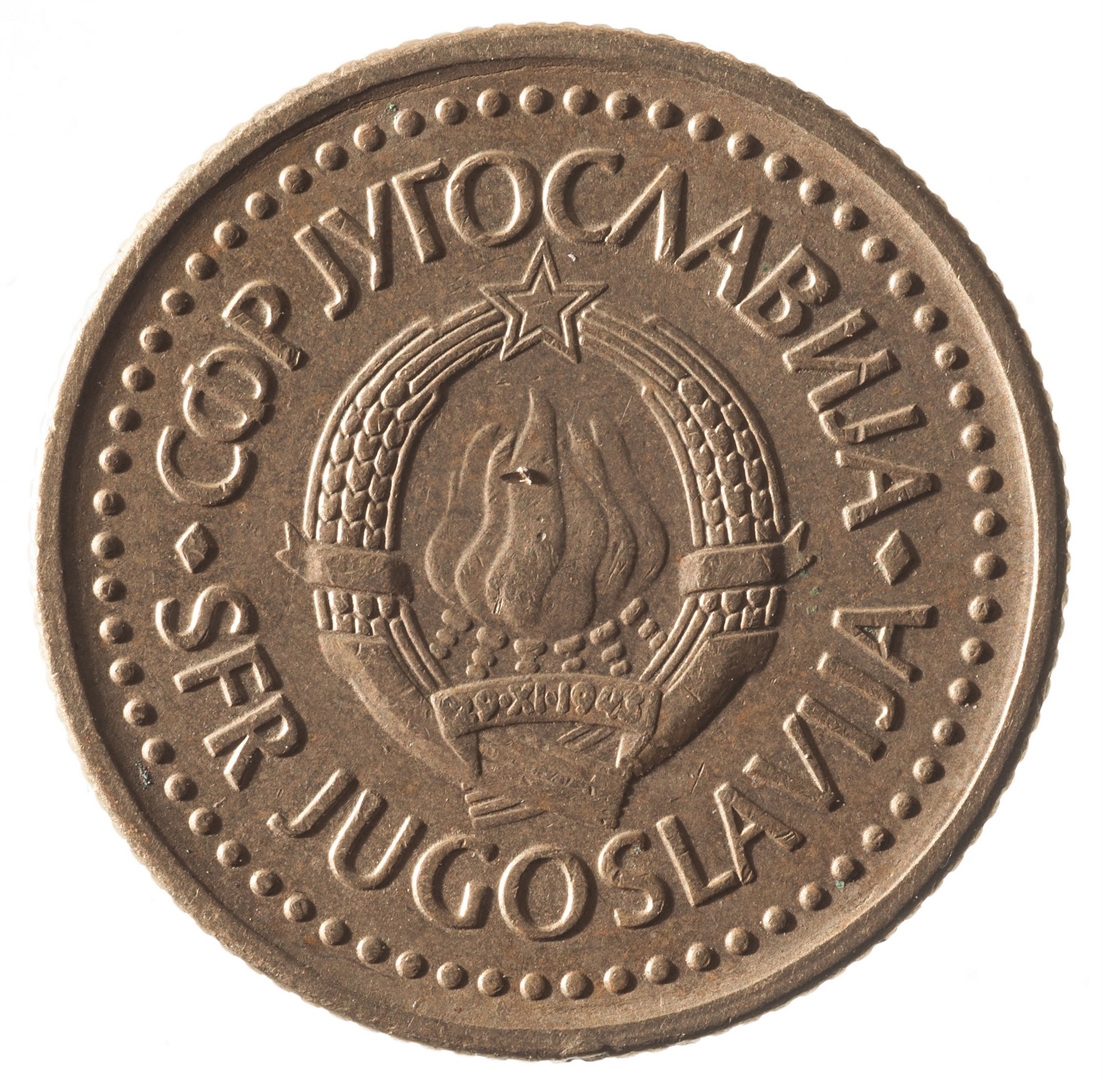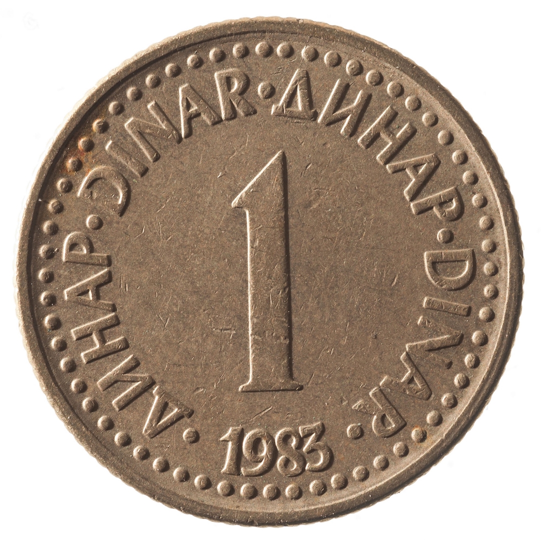 U sredini broj 1 (nominala), oko njega tekst DINAR na četiri jezika, a ispod toga godina 1983.