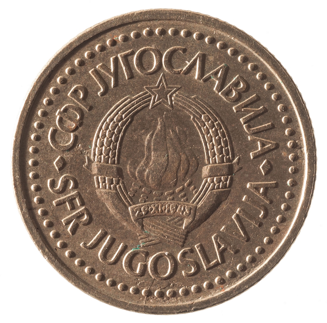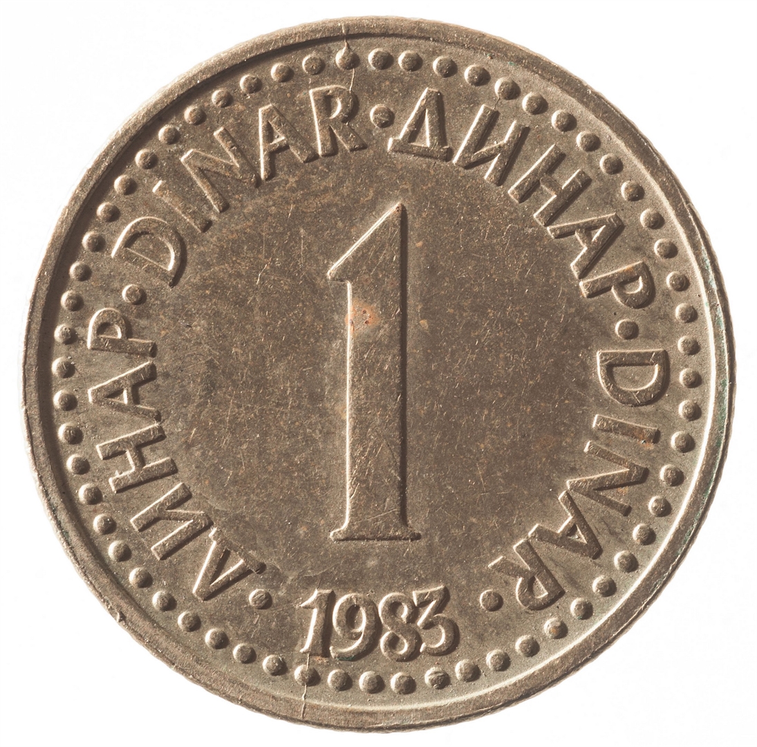 U sredini broj 1 (nominala), oko njega tekst DINAR na četiri jezika, a ispod toga godina 1983.